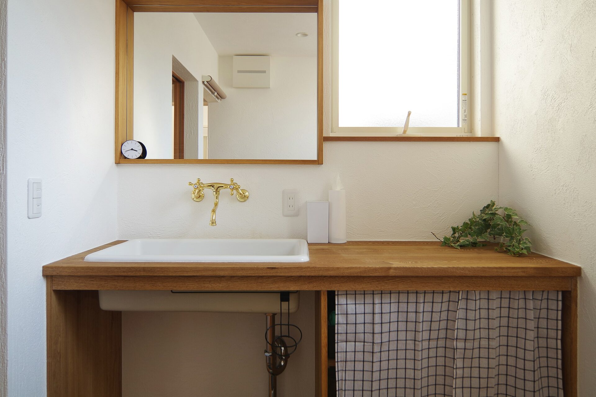 自身でカスタマイズできるよう、あえてラフに仕上げた洗面台。金の蛇口がアクセントに。