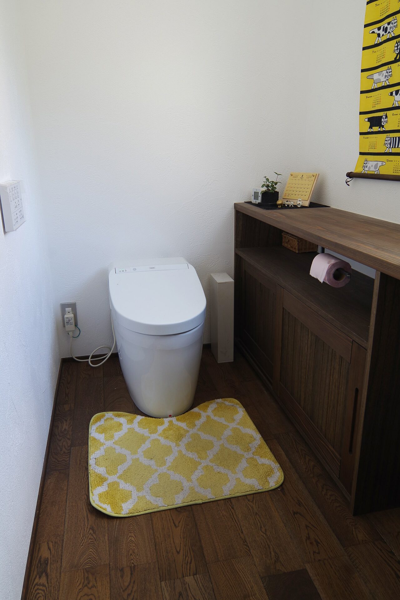 トイレの手洗いカウンターも無垢材の造作でオシャレに。