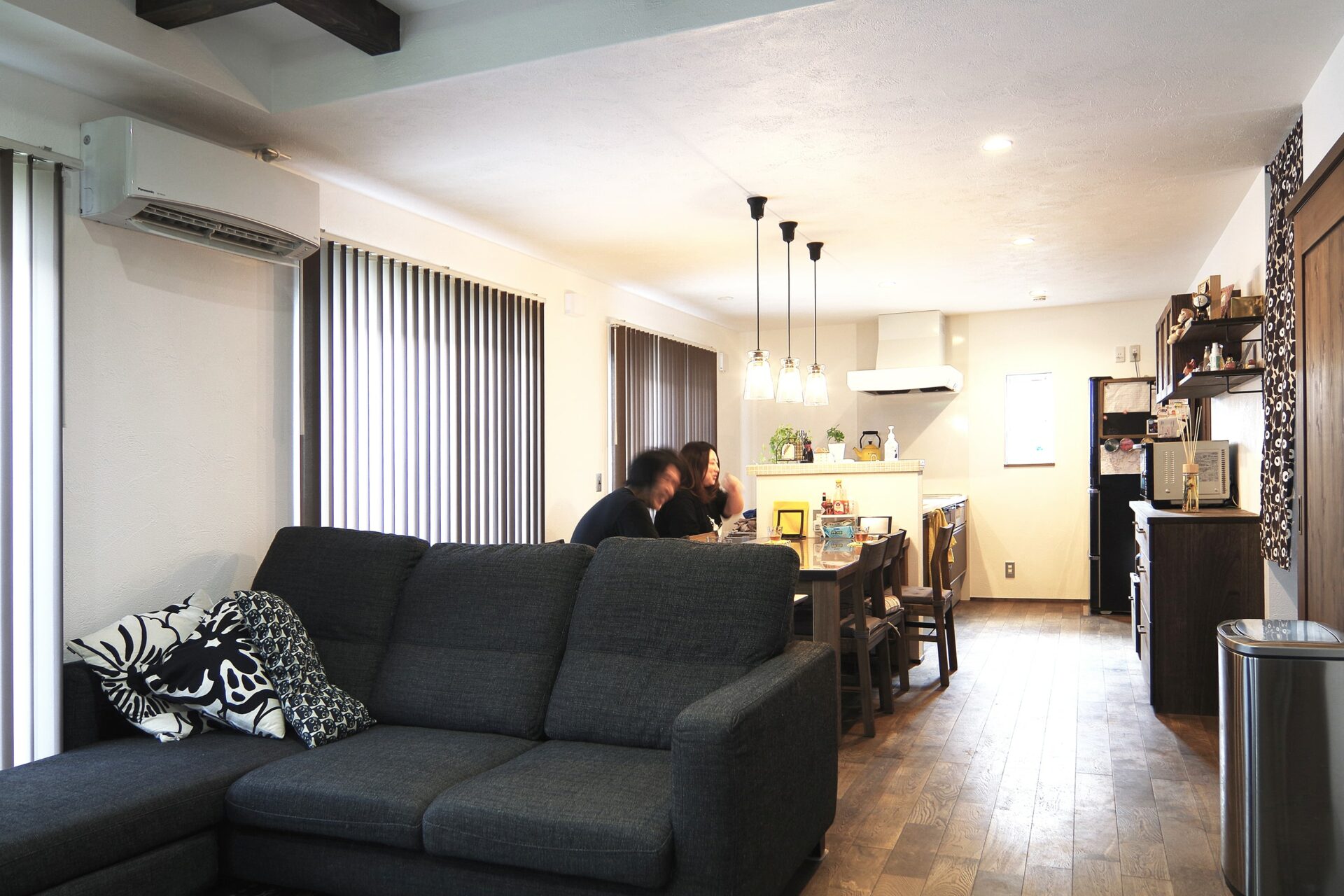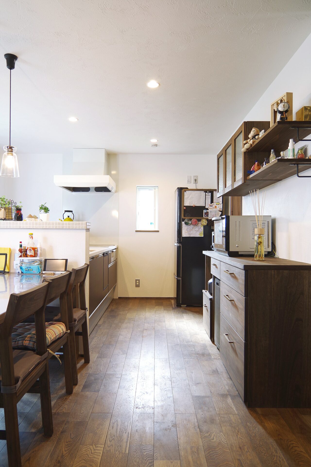 北欧風の「木」の家がよかったと話すA様。床や家具はビターの色で統一し、シックな印象の中にも可愛らしい北欧雑貨が点在。