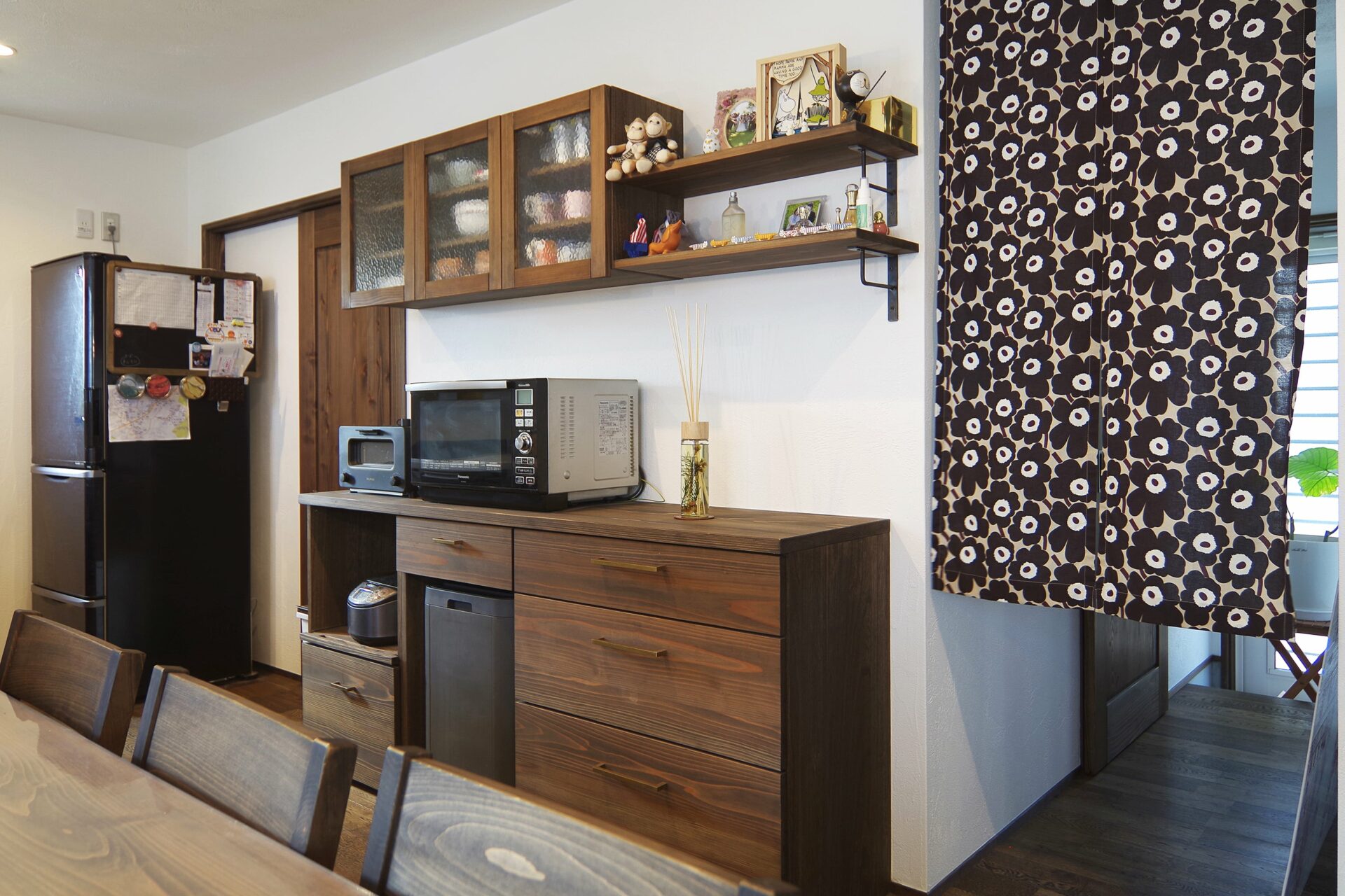 キッチンの背面収納はお客様に合わせて、ゴミ箱や炊飯器などが綺麗に収まるよう設計しています。