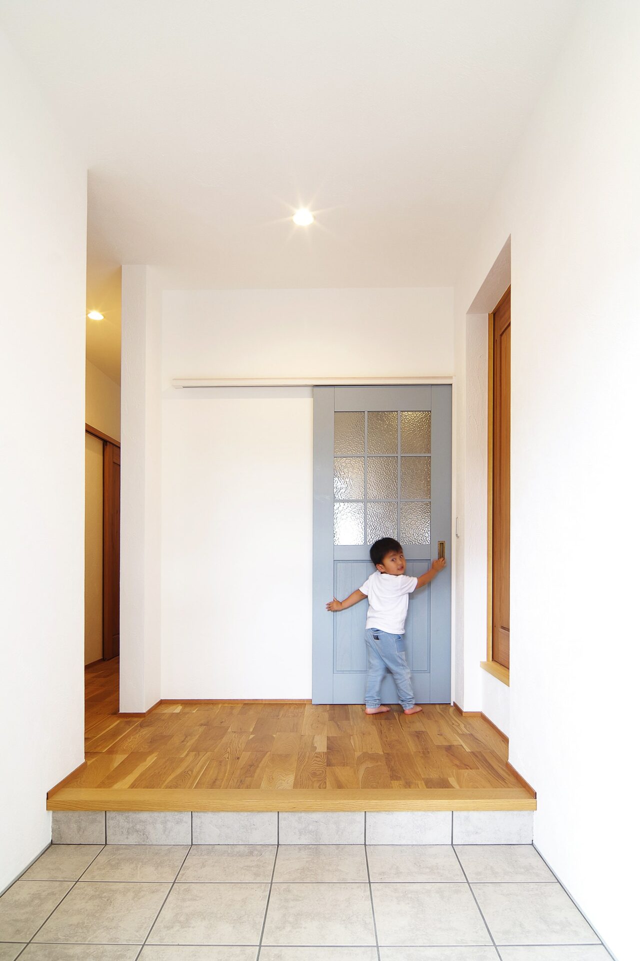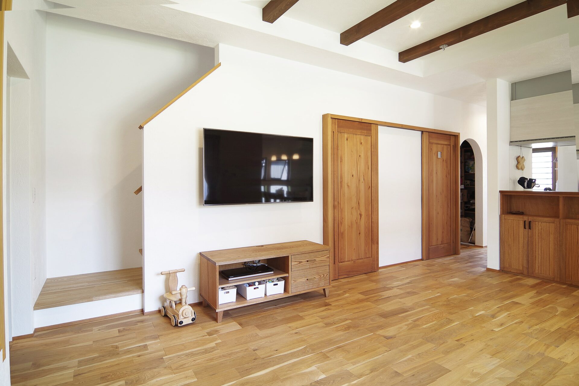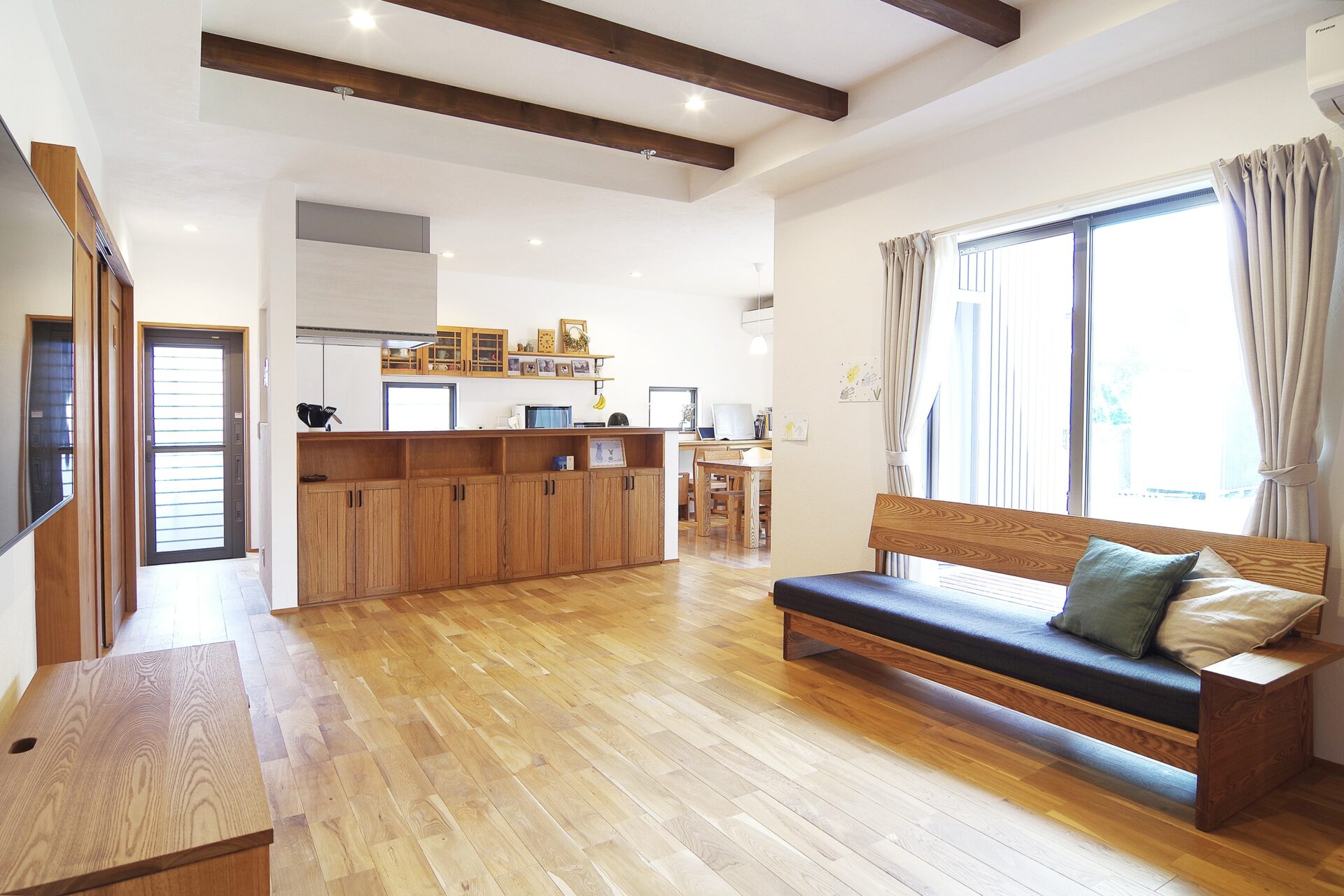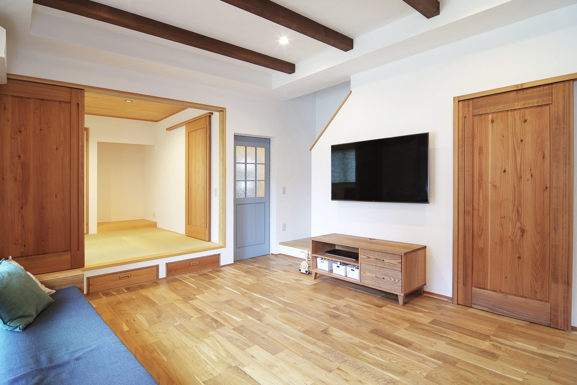 建具は自社家具工房のオリジナル。無垢材に木の呼吸を妨げない自然健康塗料で仕上げています。お好きな色に塗装できるのでオリジナル感あふれる空間に仕上がります。