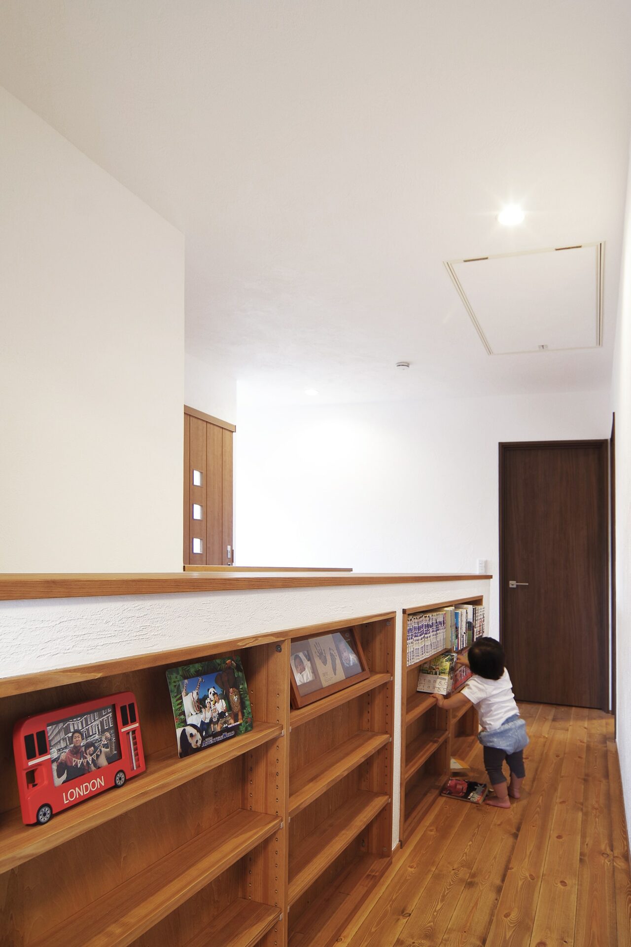 廊下に本棚。まるで図書館のように本が身近にある暮らしができそうです。