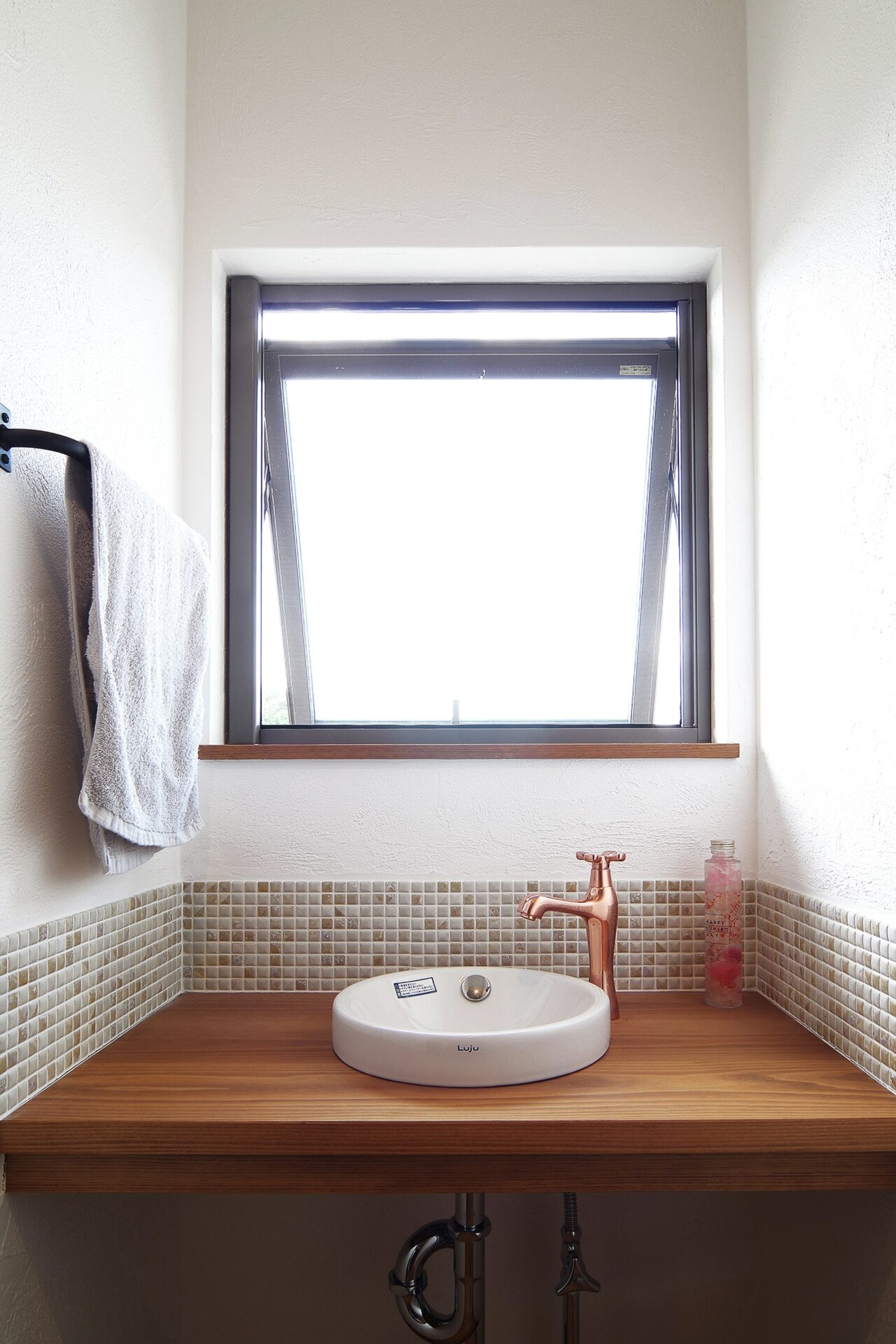 小さいスペースに設けた手洗い場も無垢材とタイルでおしゃれに。蛇口や洗面ボウルにもこだわりました。
