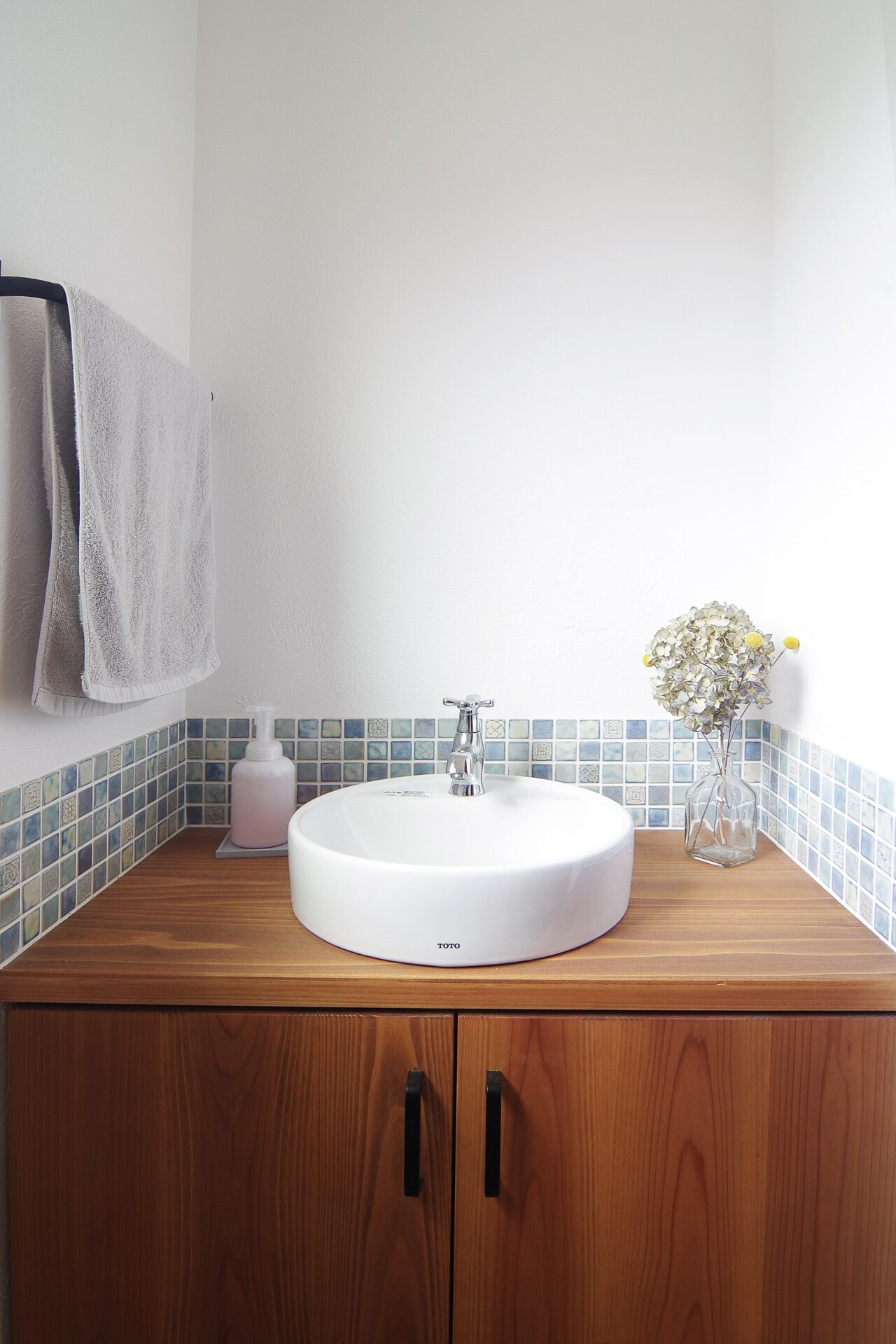 洗面化粧台は淡いブルーのタイルづかいで爽やかな雰囲気に。 飽きがこない、使い込むほどに馴染み愛着が湧いてきます。