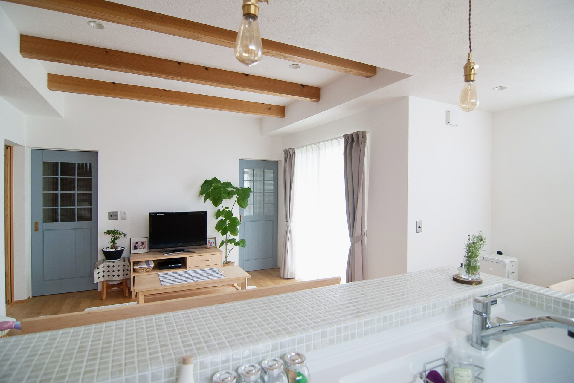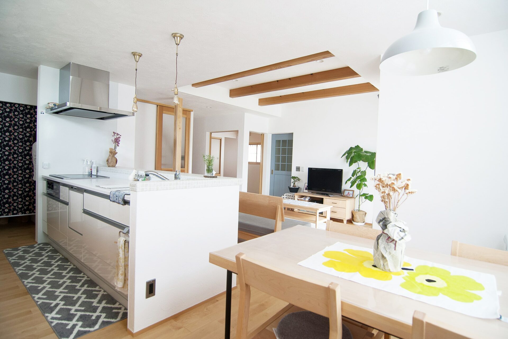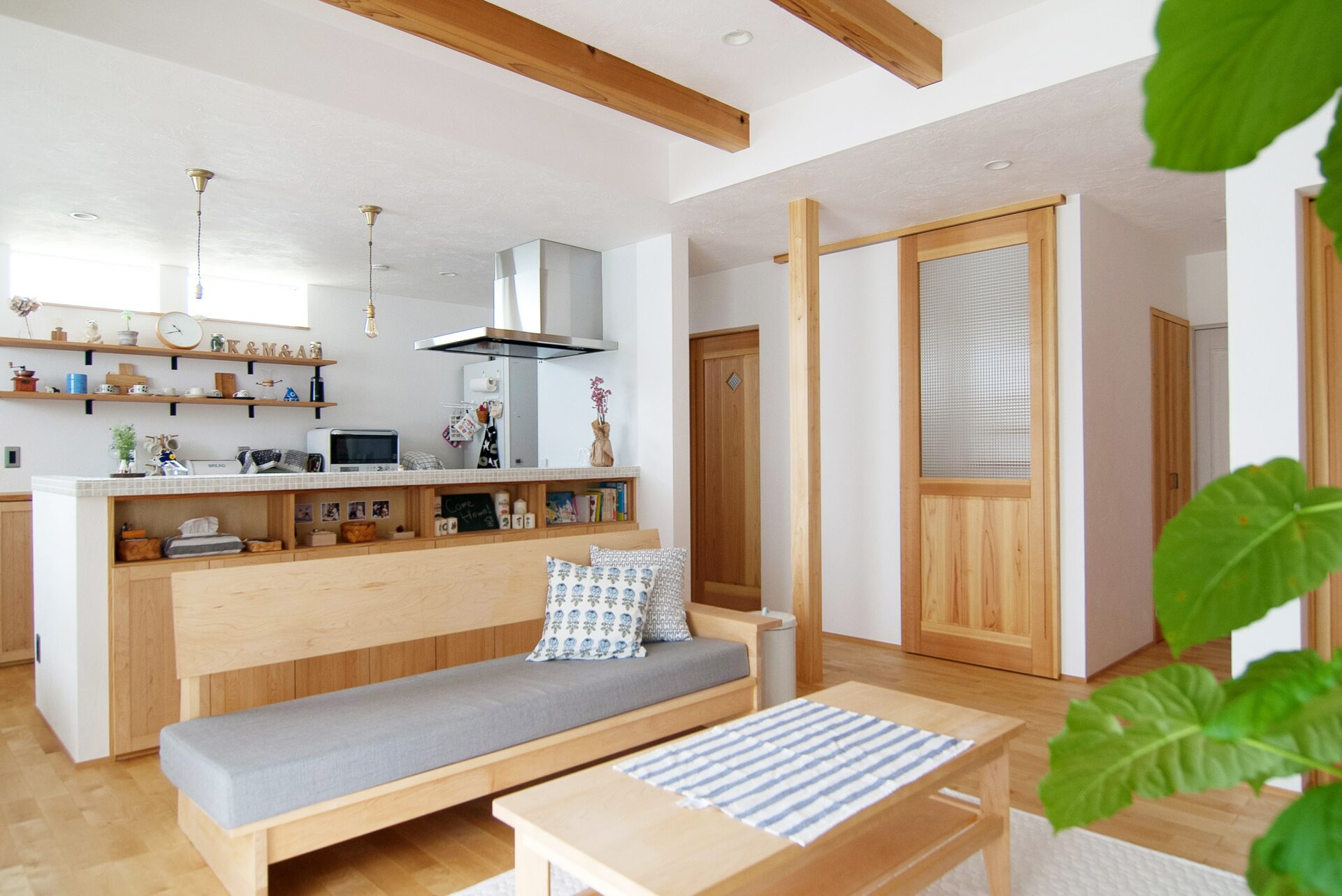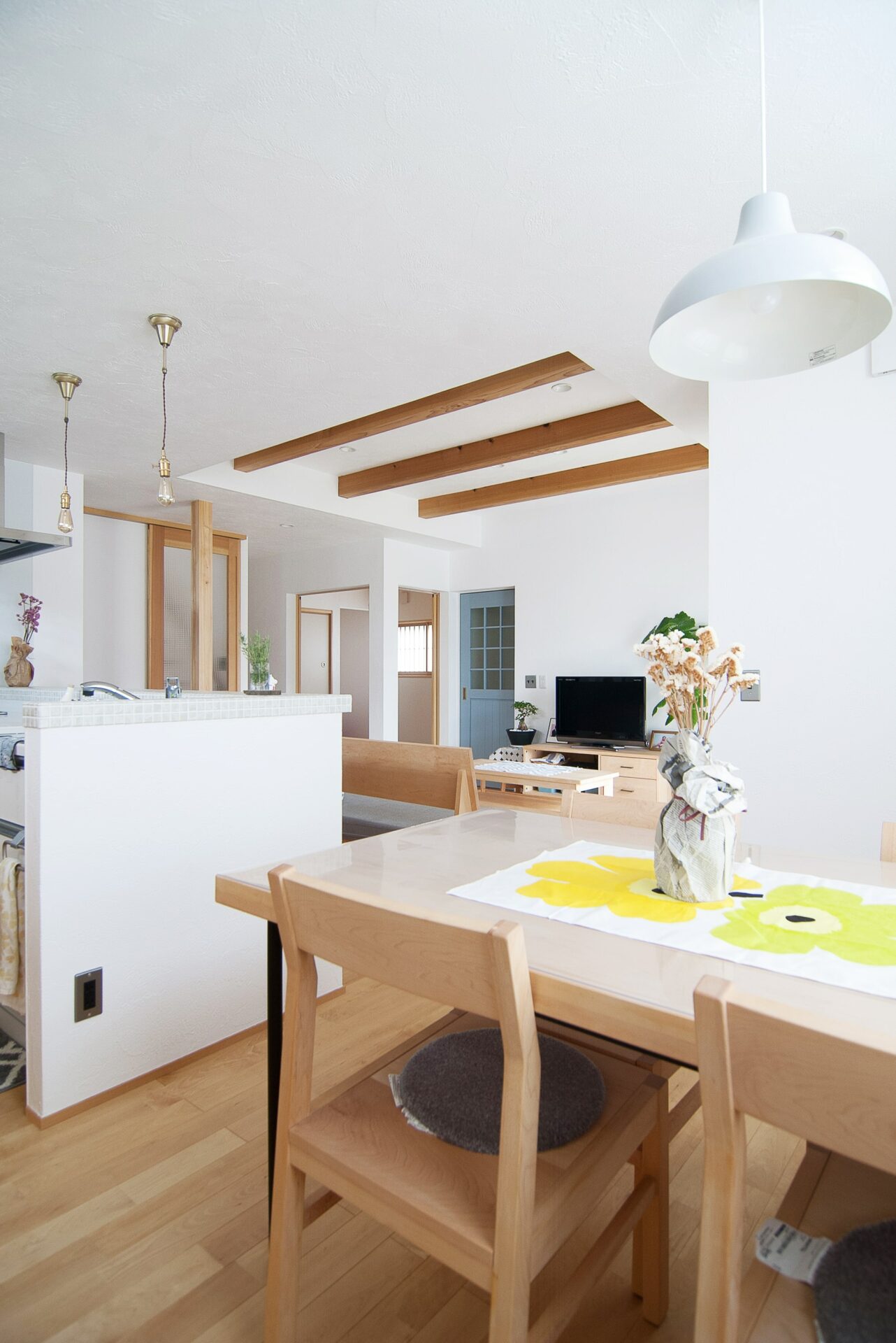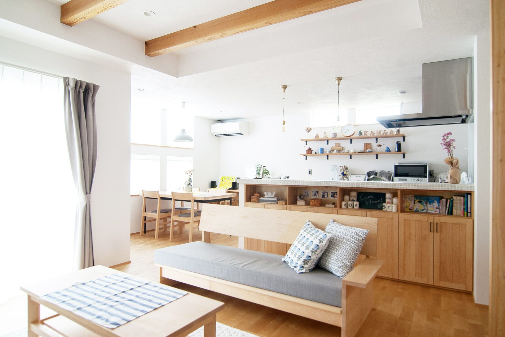 漆喰にオイル塗装で無垢材の色をそのまま使用した内観が一層明るさを与えてくれる岐阜市の注文住宅、O様邸。元々北欧風のインテリアが好きなお施主様。そんなナチュラルな小物を楽しみたいと、シンプルな色合いをチョイス。 モノトーンの開放的な空間に鮮やかな色が映えてオシャレで居心地のいいLDKに。 「周りに気を使ったり窮屈な思いをすることがなくなって家にいることが好きになりました」と語ってくれました。