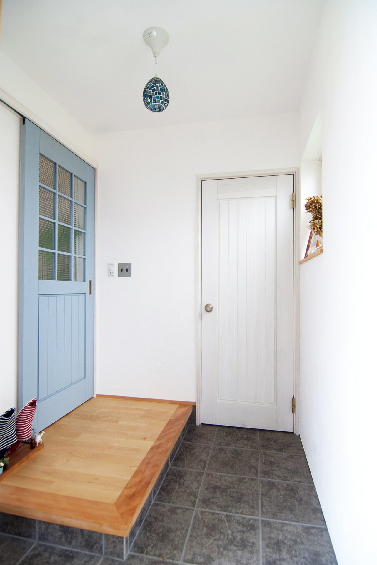 爽やかな印象の玄関。ブルーグレーの建具とモザイク照明が北欧の雰囲気を醸します。