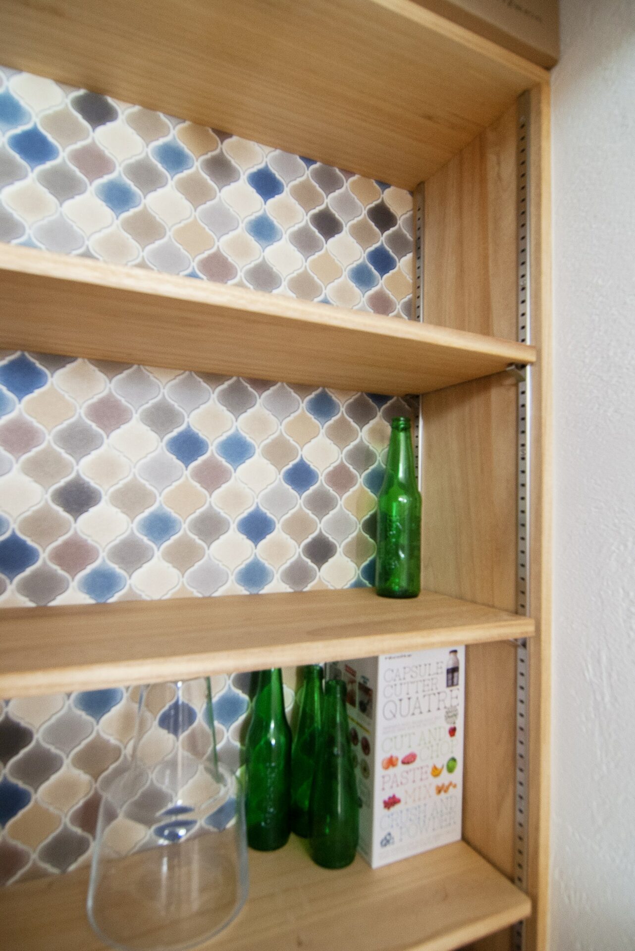 コラベルタイルをアクセントに用いたの造作棚には、ちょっとした小物を置くことができるディスプレイ空間に。