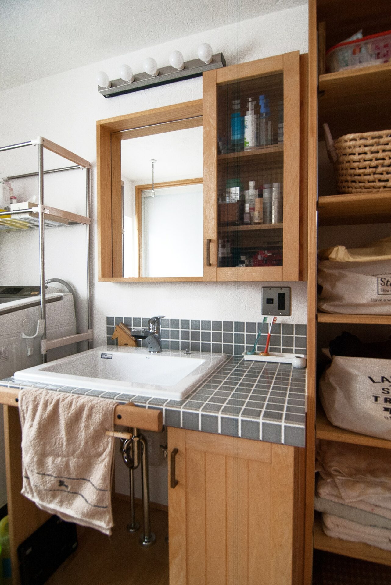 無垢材とタイルの洗面化粧台。自社工房で作られているのでお好きなモザイクタイルを選ぶことができます