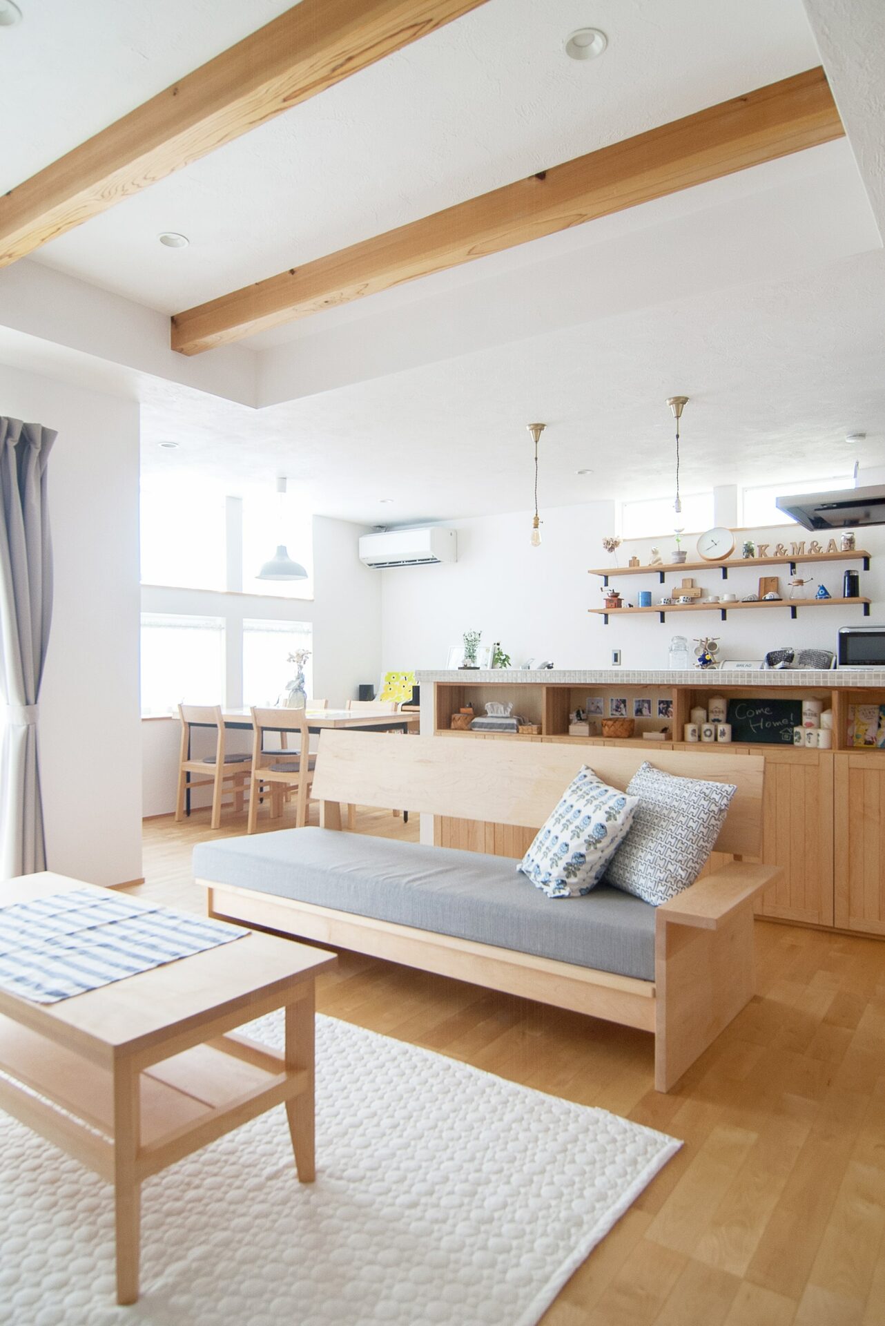 ソファやリビングボードは自社工房で作られたオリジナル無垢家具です。無垢材のフローリングに合わせて統一されたインテリア空間に。