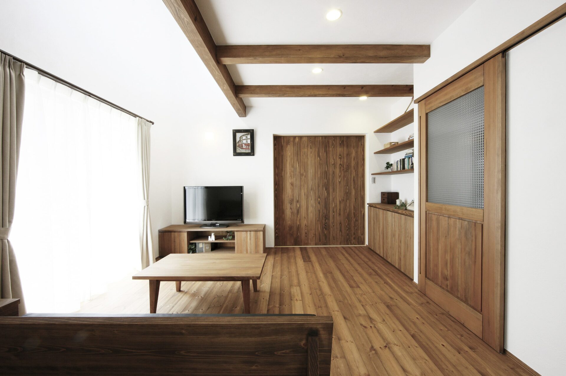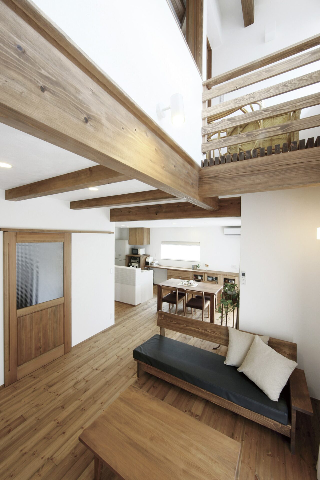 光が差し込む吹き抜けのある天井は無垢の梁でぬくもりあふれる空間に。ダイニングテーブルもソファも全て自社製のオリジナル家具です。キッチンに用いられたワッフルガラスは、ほんのりレトロ感のある温かみある雰囲気に。