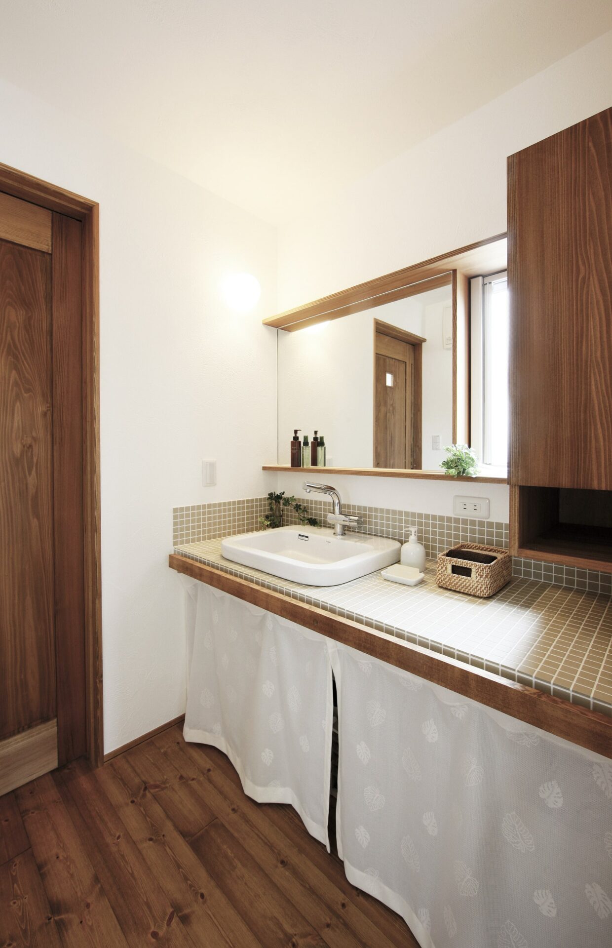 オリジナルで造られたタイルがカワイイ洗面化粧台も、注文住宅だからできる広めの仕様になっています。