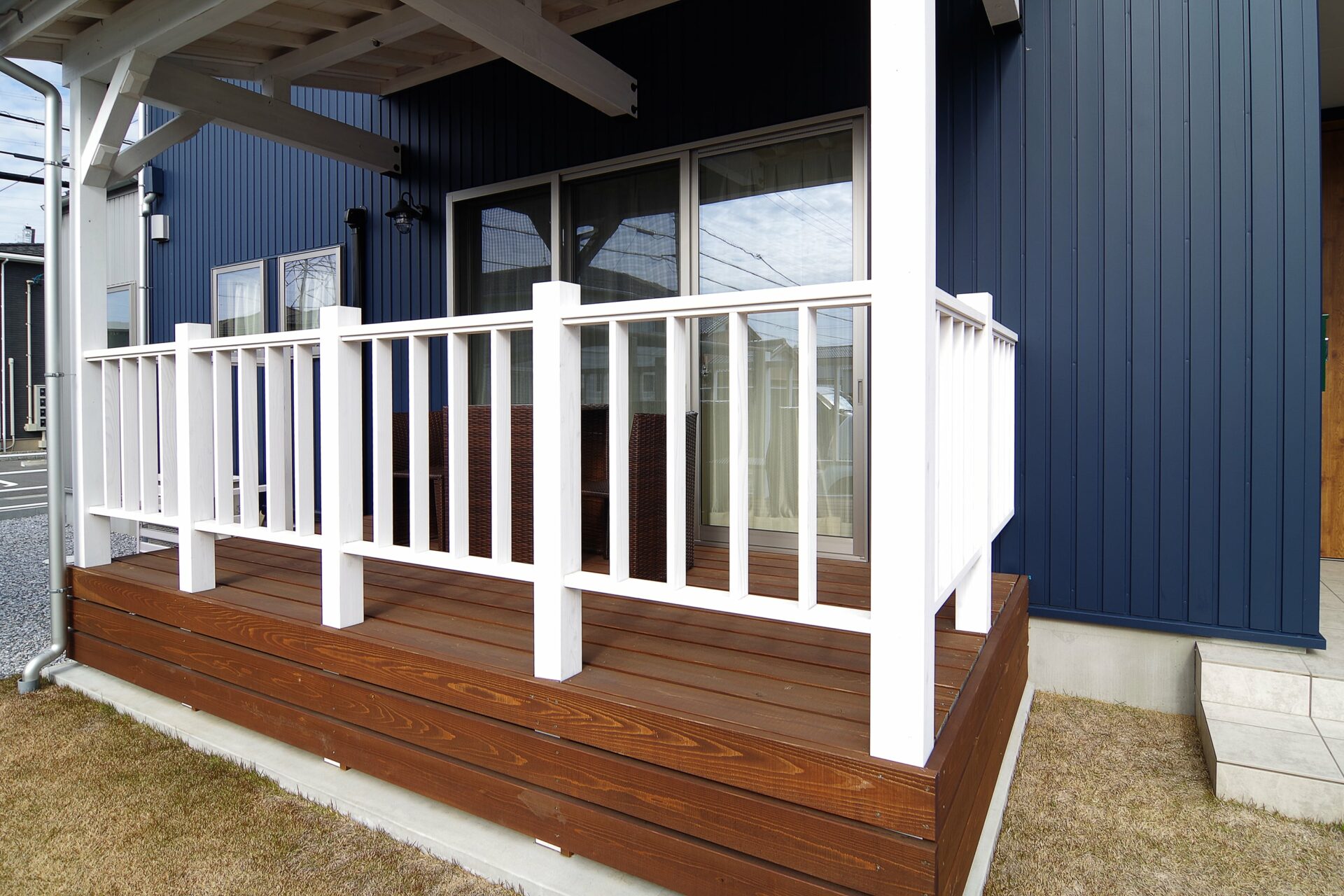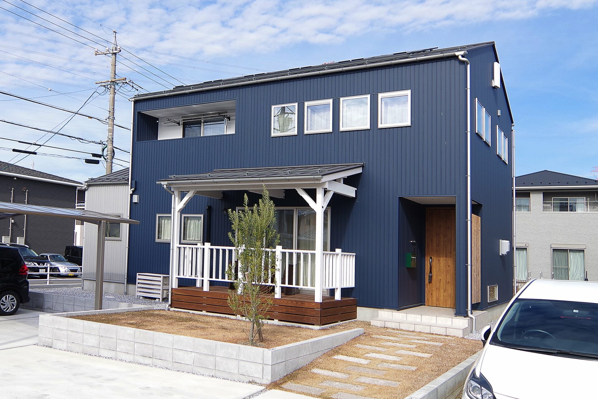 岐阜県大垣市に完成したのはブルーガルバリウムがあざやかなラナイのあるお住まいです。 サッシやラナイの柱にホワイト塗装を施し、ブルーガルバをより引き立たせました。
