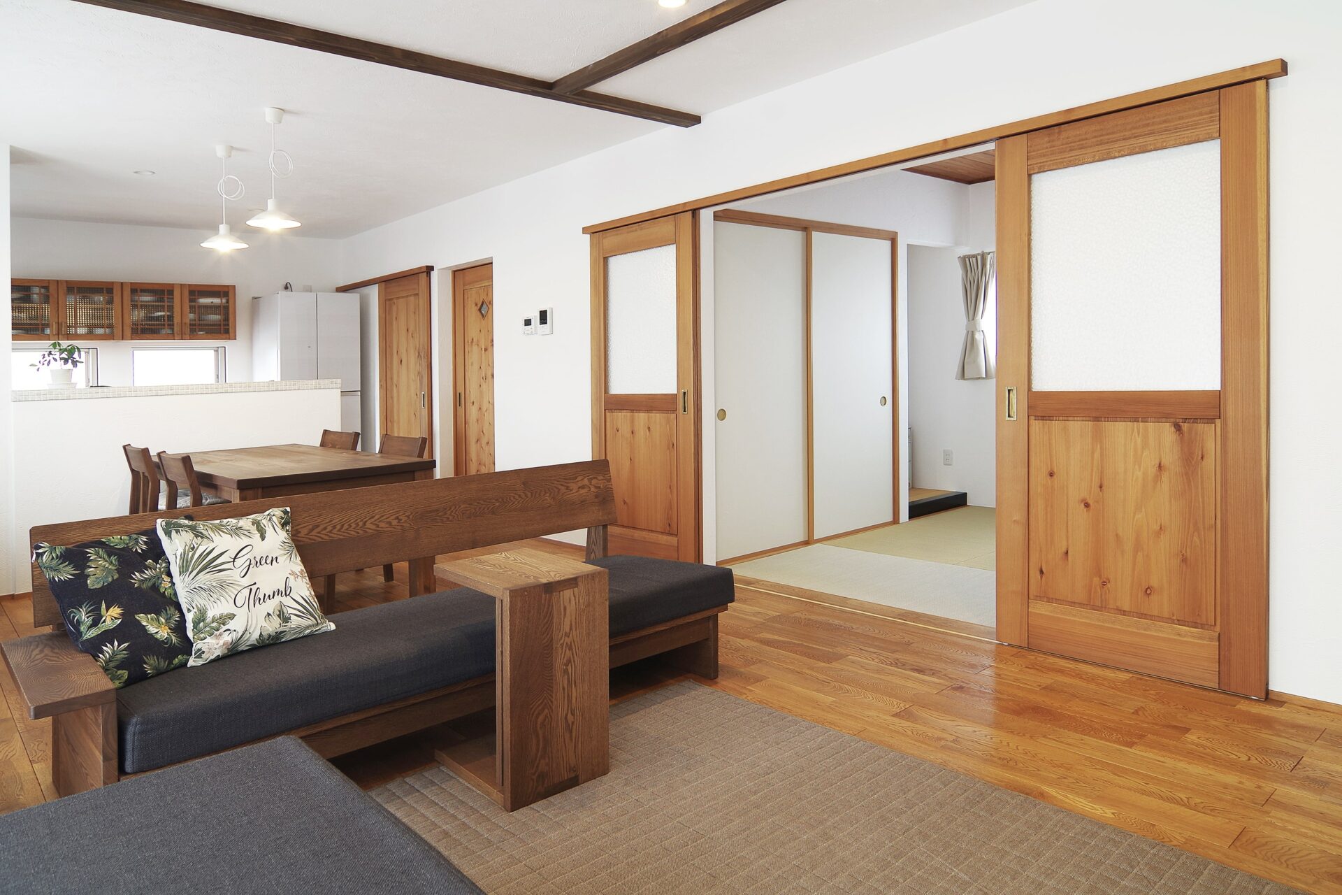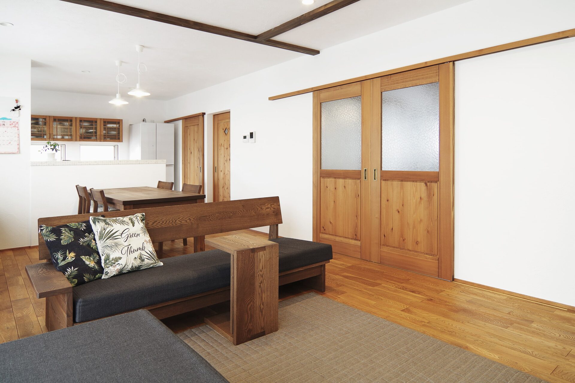ナチュラルで落ち着いた雰囲気のテイストでナラ無垢のさらさらとした肌触りと合わせ、居心地のよさを追求。
