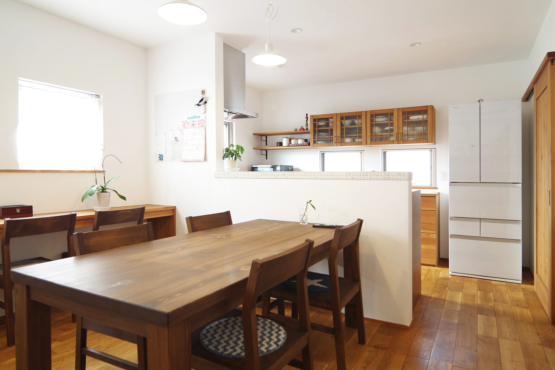 ダイニングセットはフローリングとは違うカラーの塗装にし、より落ち着いた色合いをチョイスしました。 「無垢の家具がどのように変化していくのか今から楽しみです。」