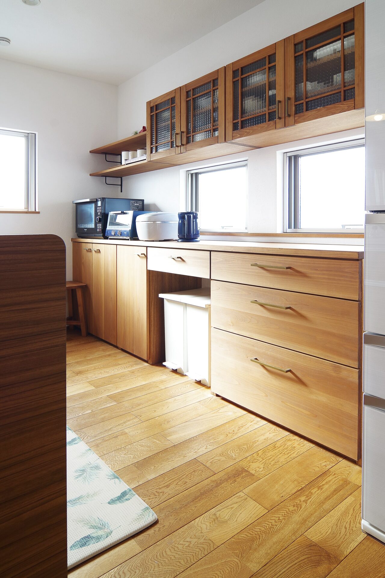 フローリングとは違うカラーの塗装にし、より落ち着いた色合いをチョイスしました。 「無垢の家具がどのように変化していくのか今から楽しみです。」