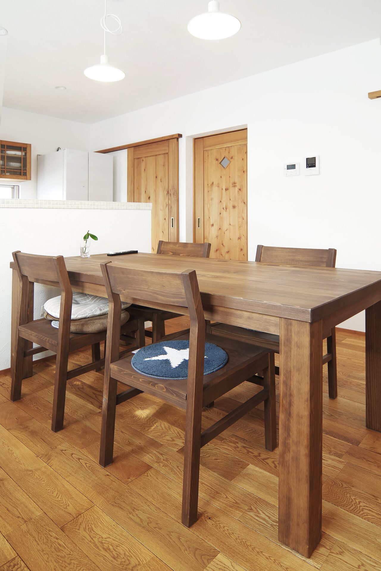 ダイニングセットは、フローリングとは違うカラーの塗装にし、より落ち着いた色合いをチョイスしました。