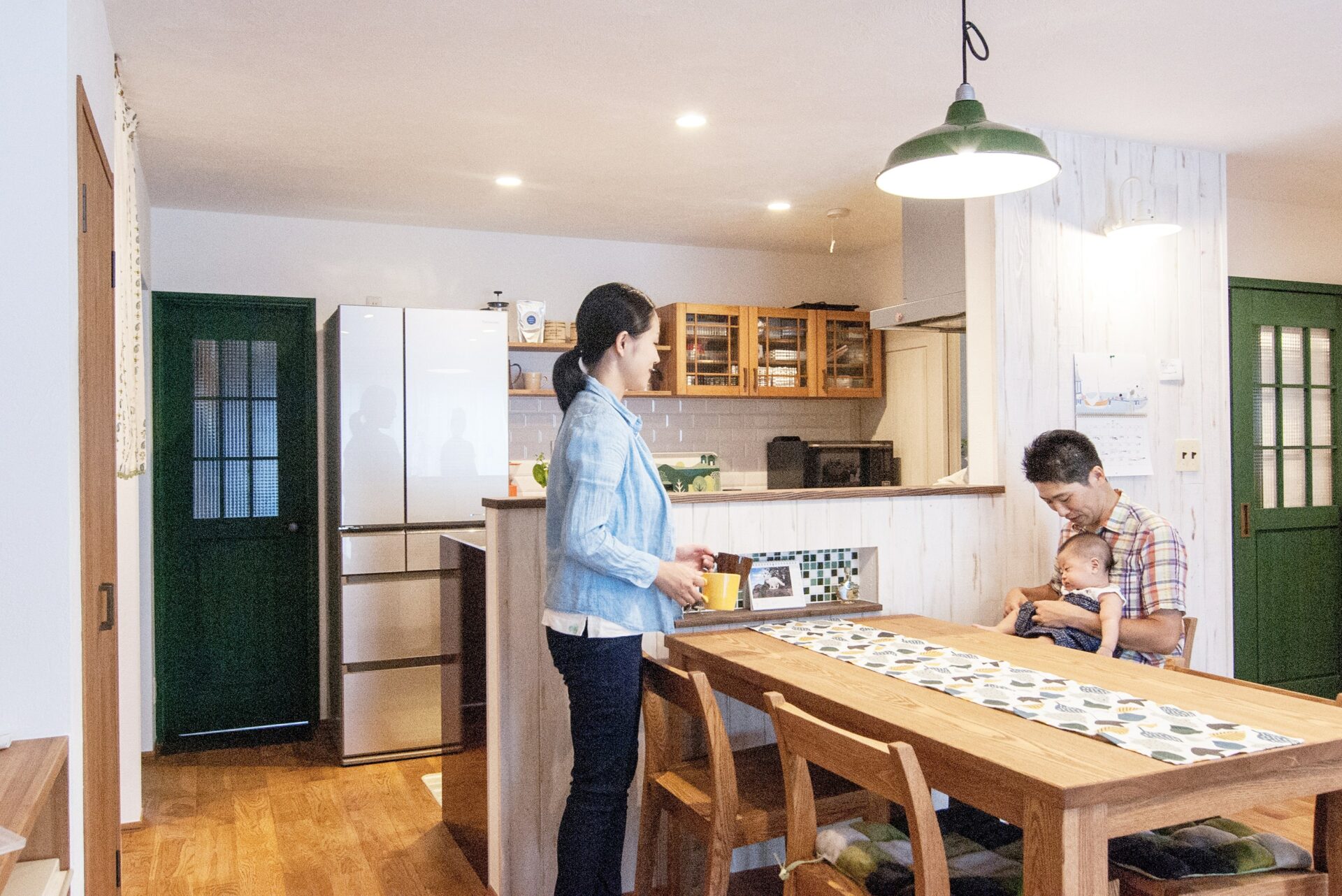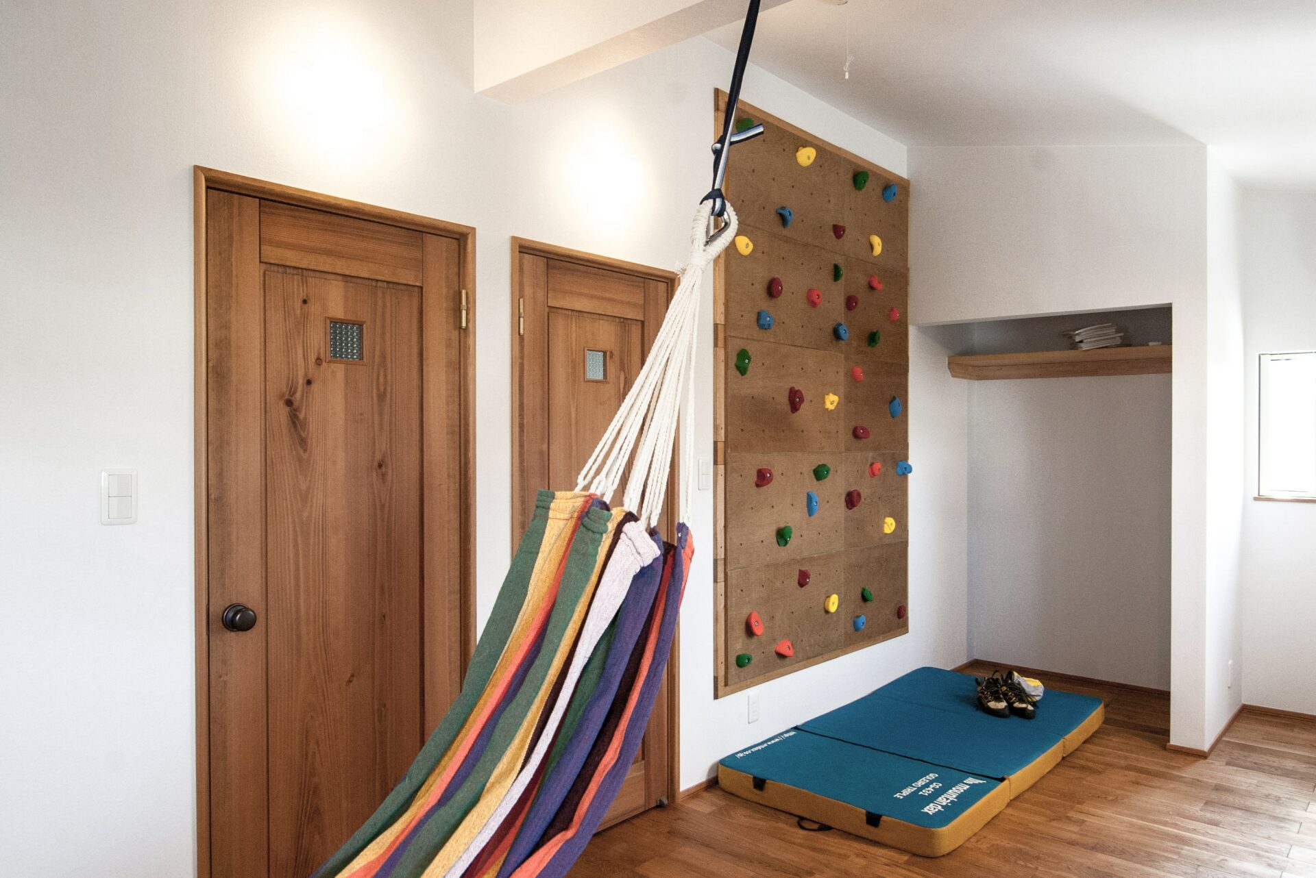 注文住宅だからこそお子様の部屋に備えられたボルダリングのできる壁や印象的な緑の建具など、ご要望に応じた施工ができるのが魅力です。