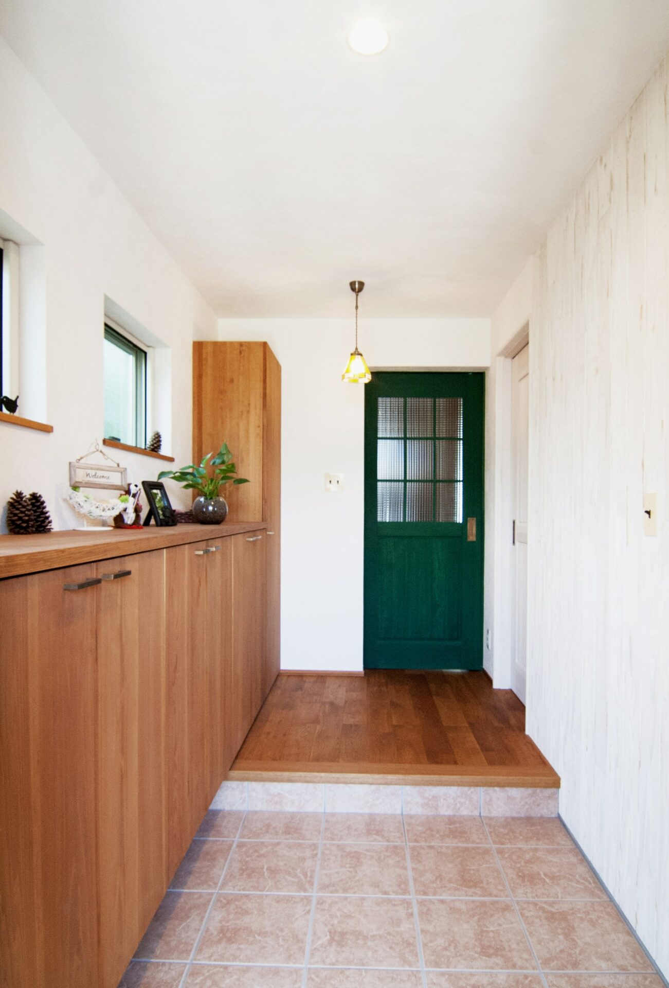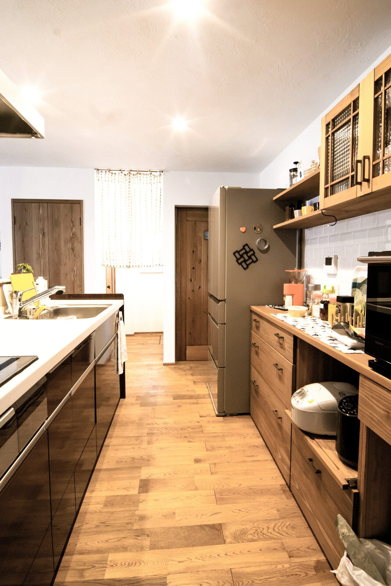 シューズボックス・建具も無垢材で造作。アンティークな照明など、細部までこだわりが詰められました。キッチンへは玄関から直接入る動線があり、買い物帰りにわざわざリビングを通らなくてもキッチンへ行けます。