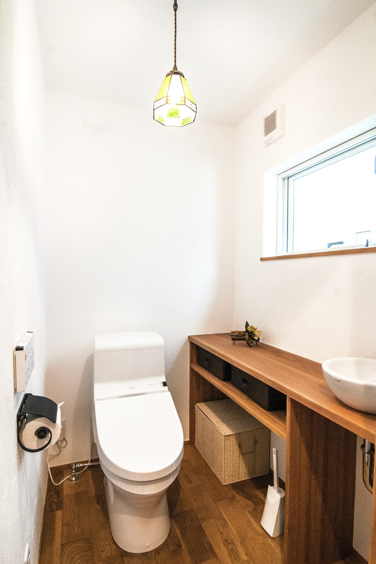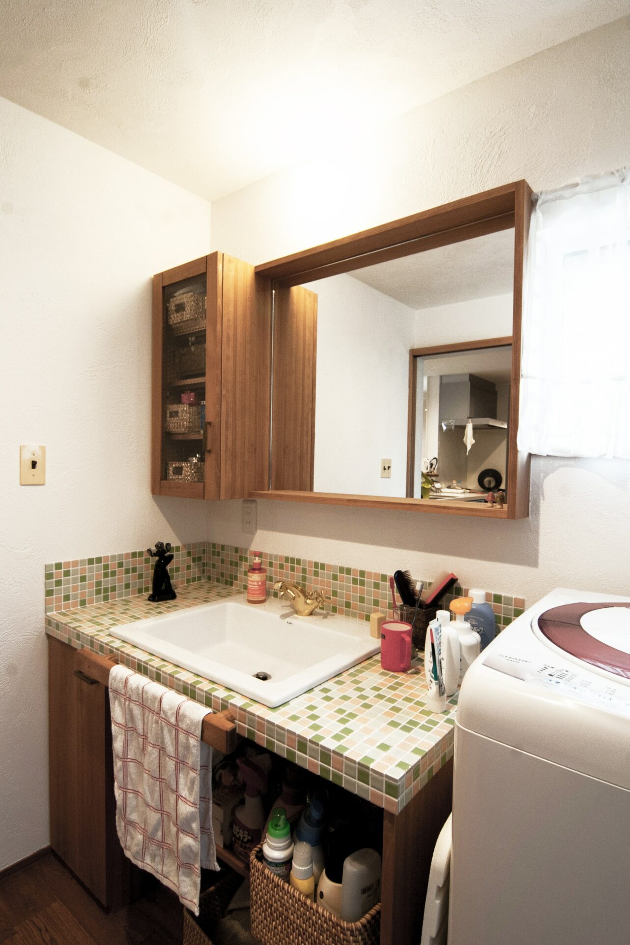 無垢材とタイルの雰囲気が可愛らしいオリジナル洗面台はご夫人が描いたイラストをもとに造作されたものです。漆喰の消臭・殺菌作用のおかげで水廻りも爽やか。土間と近い場所に設けているため、アウトドアで汚れて帰ってきてもすぐに洗面室へ行けます。