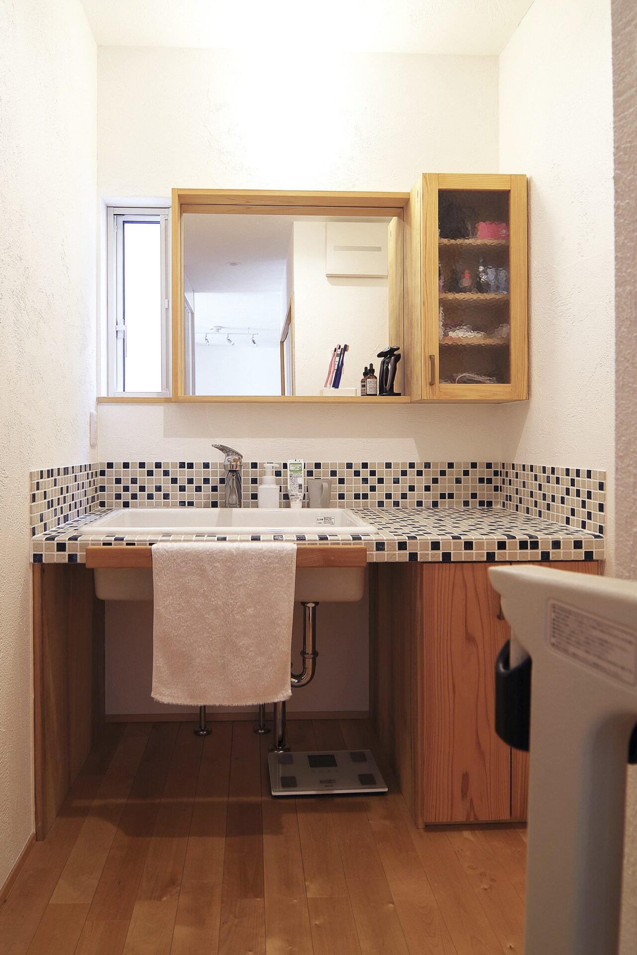 造作の洗面化粧台は奥様自ら選んだタイルと配置で制作された世界でただ一つの洗面化粧台になりました。自分で選んだものなので気に入らない所が無いと話してくれました。