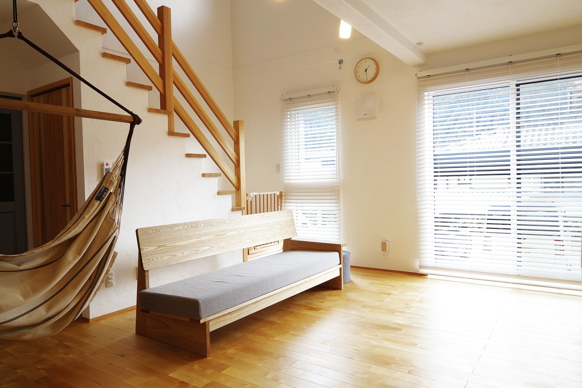 自社家具工房でつくられた無垢材のソファ。木目が美しいので無垢材フローリングとの相性は抜群です。