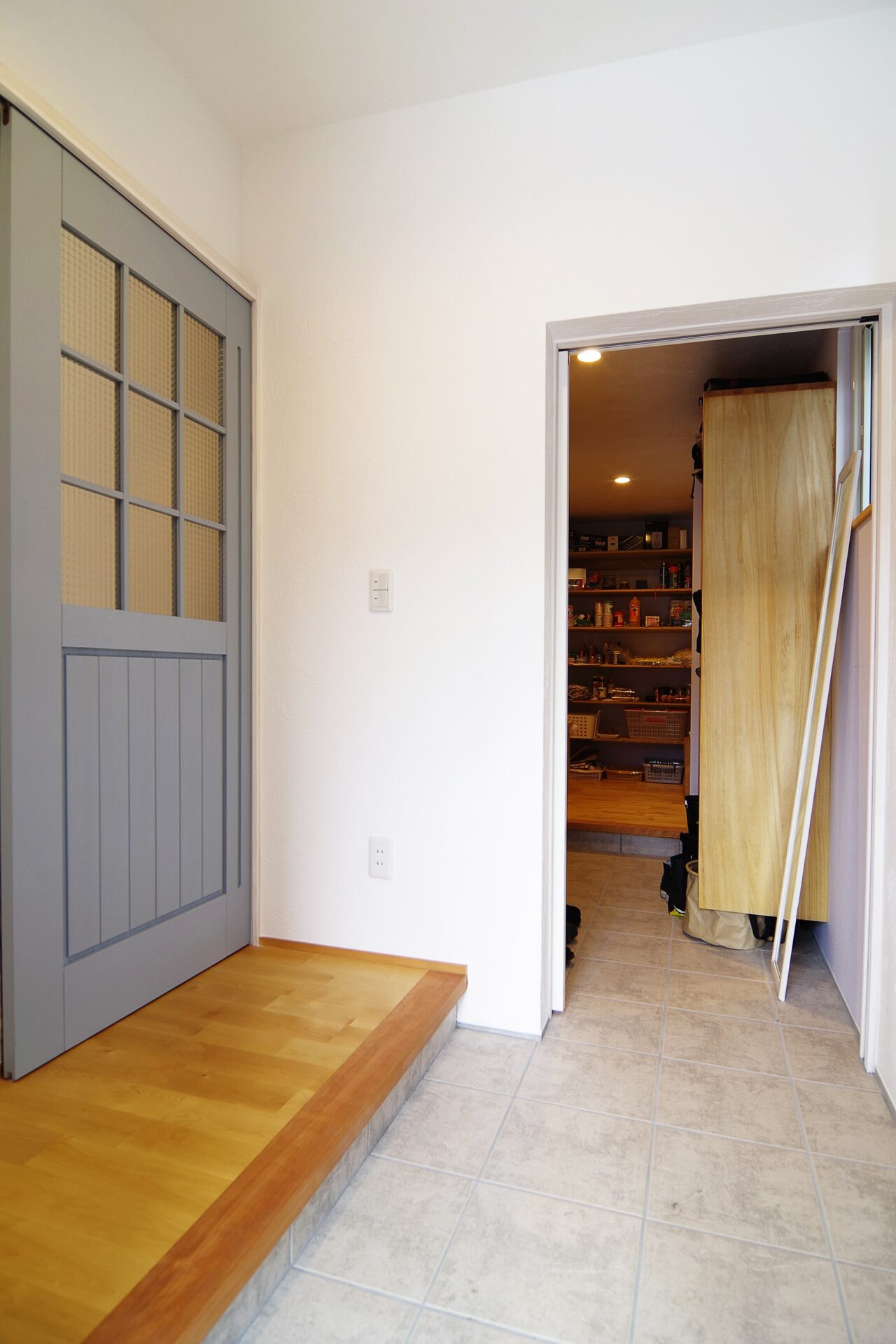 水色の無垢材の建具は自社家具工房でつくられたもの。お部屋のアクセントになりオリジナル感があふれます。