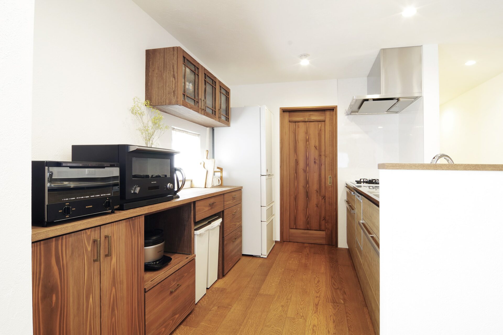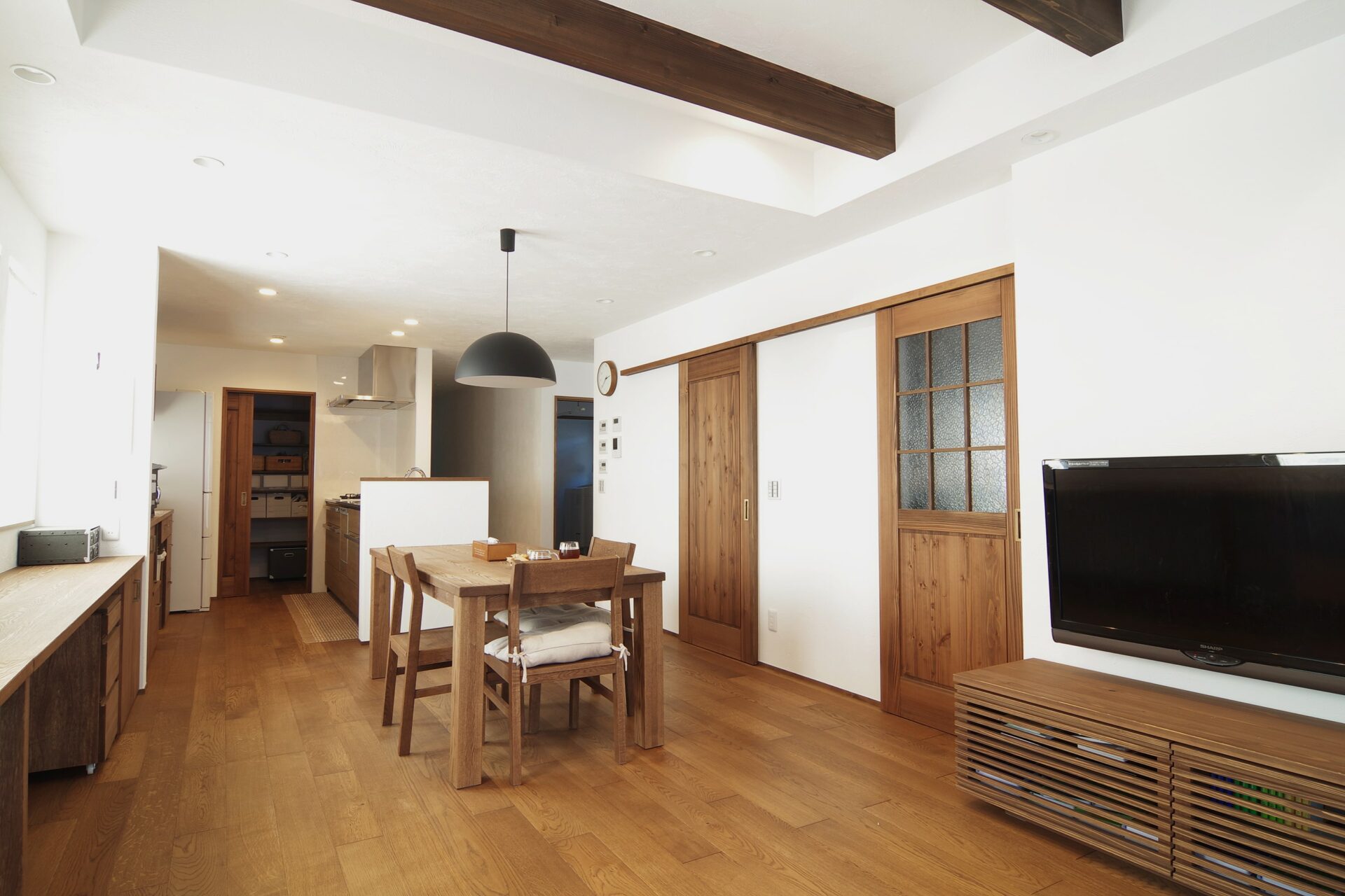 木を使ったCafeStyleの家が気に入ったというT様、パントリーやリビング収納など収納を充実させて物を外に置かないように設計したそう。扉などの建具もすべて無垢材で造作!ほぼすべての扉が引き戸なのでスムーズに出入りでき、動線を遮らないため空間もより広く使えます。扉の一部には摺りガラスの格子を取り入れて、ぬくもりのあるデザインに