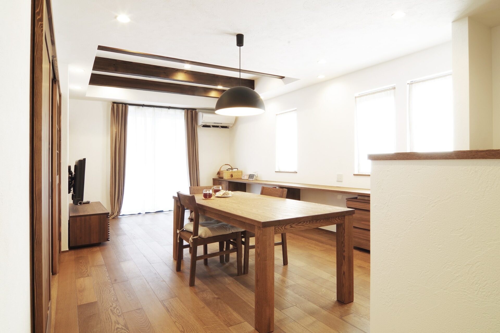 壁一面に取り付けられたカウンターテーブルは4mもあり、3人一緒に座ってもゆとりある長さ。子どものスタディスペースや、夫婦のお仕事スペースにフル活用!