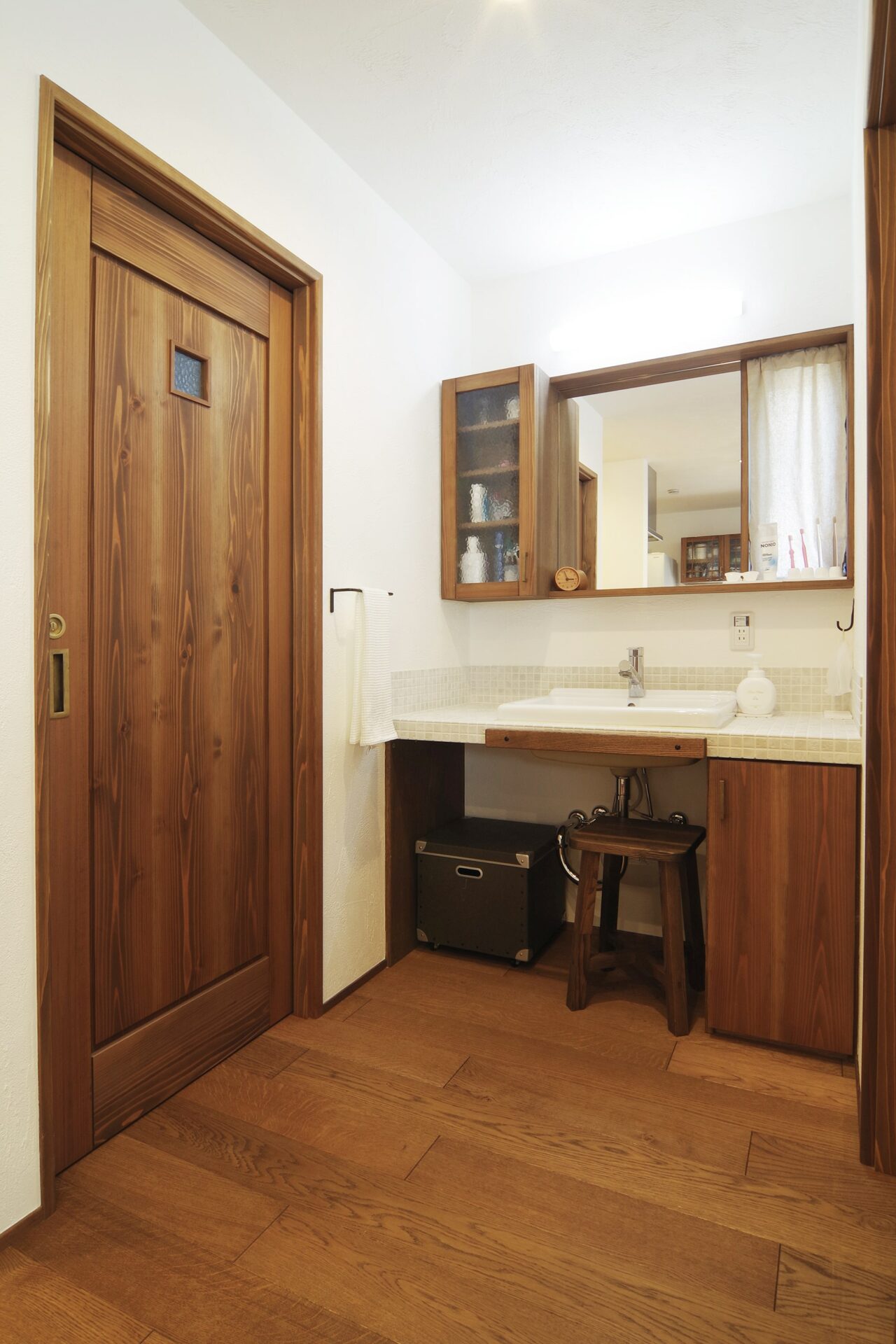 無垢材とタイルで造作した洗面スペース。木目を強調するために、塗装で少し色を濃くしたという。「水ハネや汚れがあっても、サンドペーパーで軽くこするだけで、元通りになるのが、無垢材のいいところ。小さなキズも味わいになり、経年変化も楽しめます」