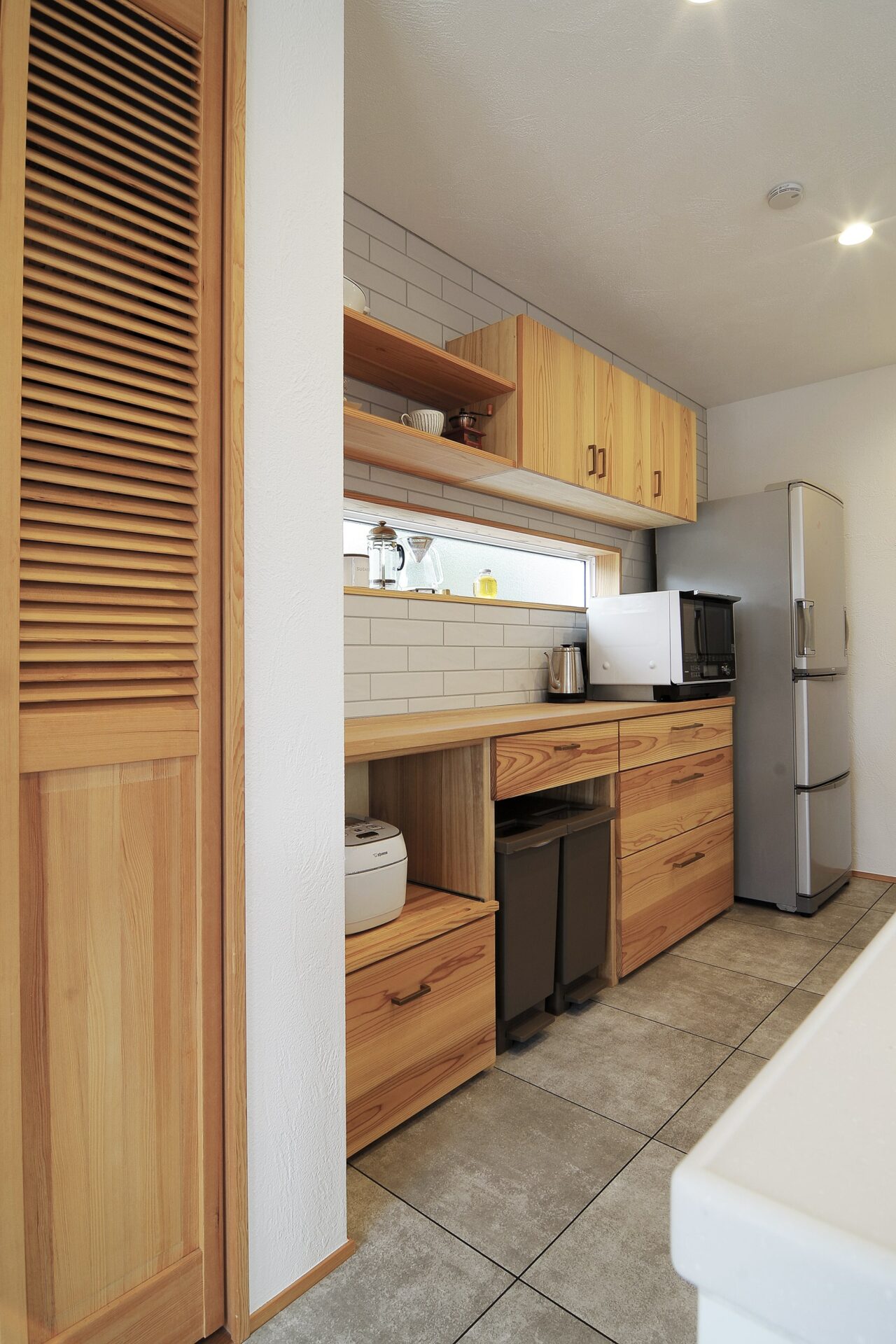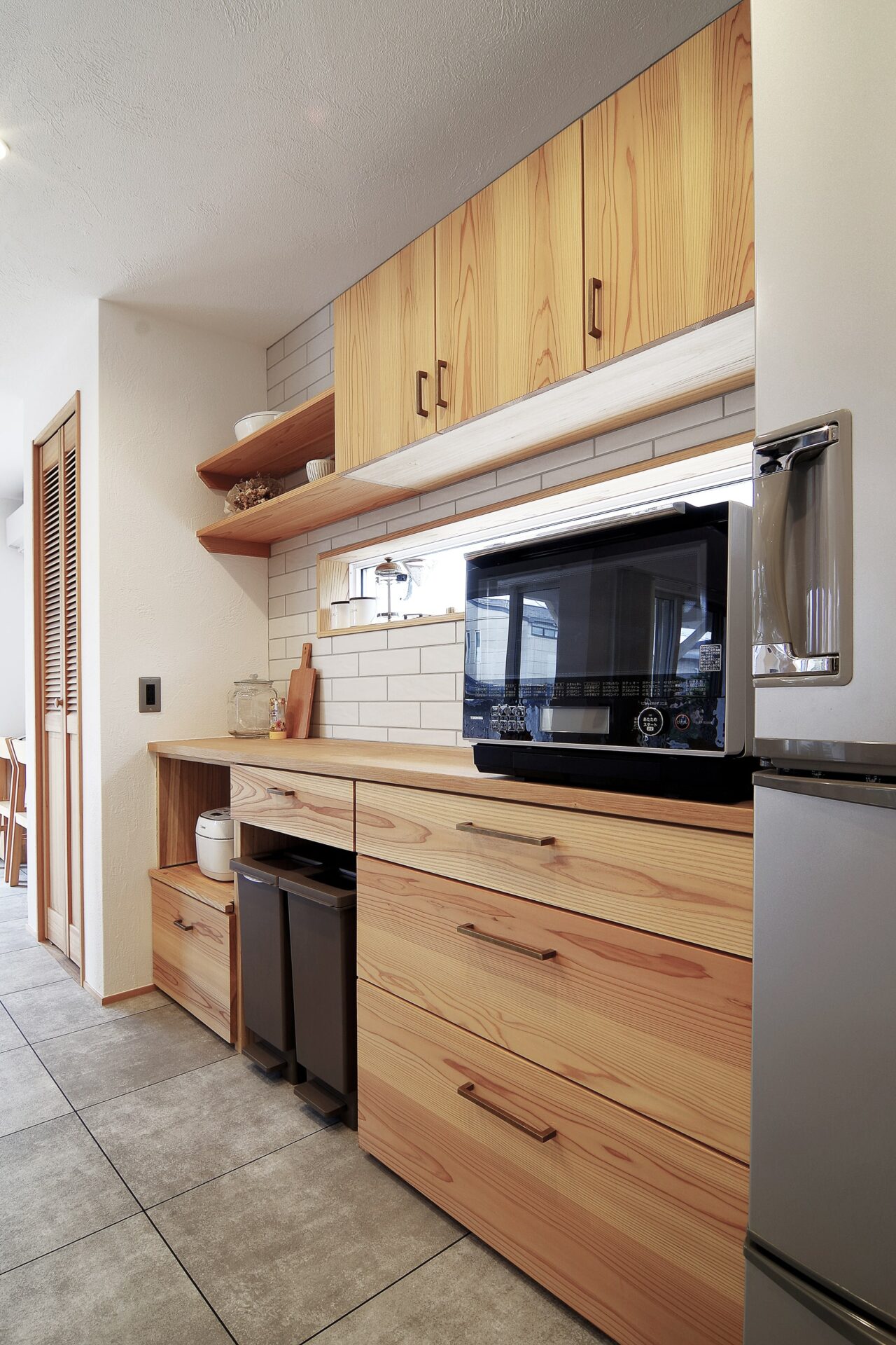 北欧風の明るい色合いの造作家具。 キッチン背面収納はすっぽりそこに入るように大きさを設計した特注品です。