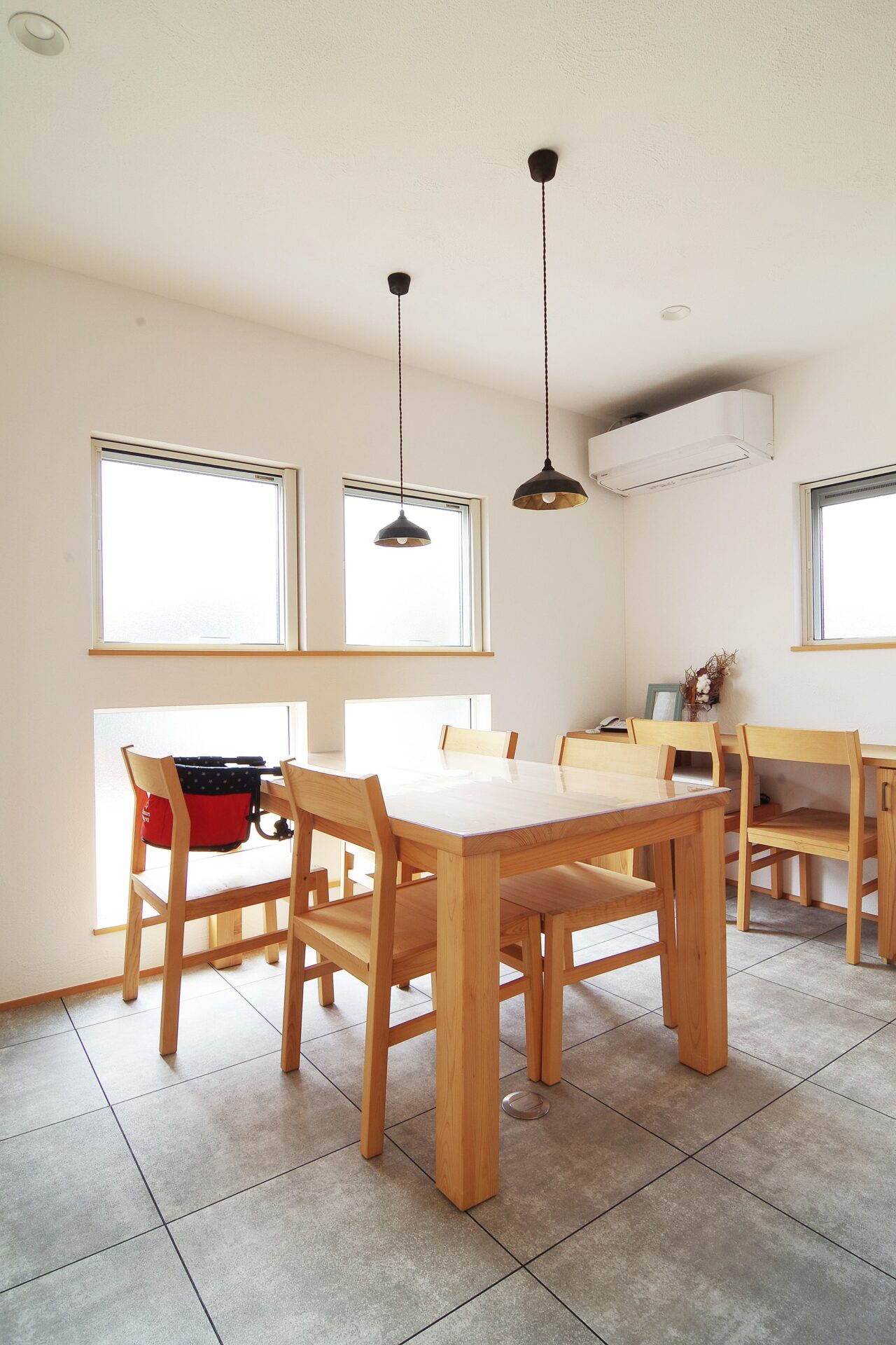 キッチン廻りのメンテナンスのしやすいようダイニングキッチンの床はフロアタイルを採用しました。