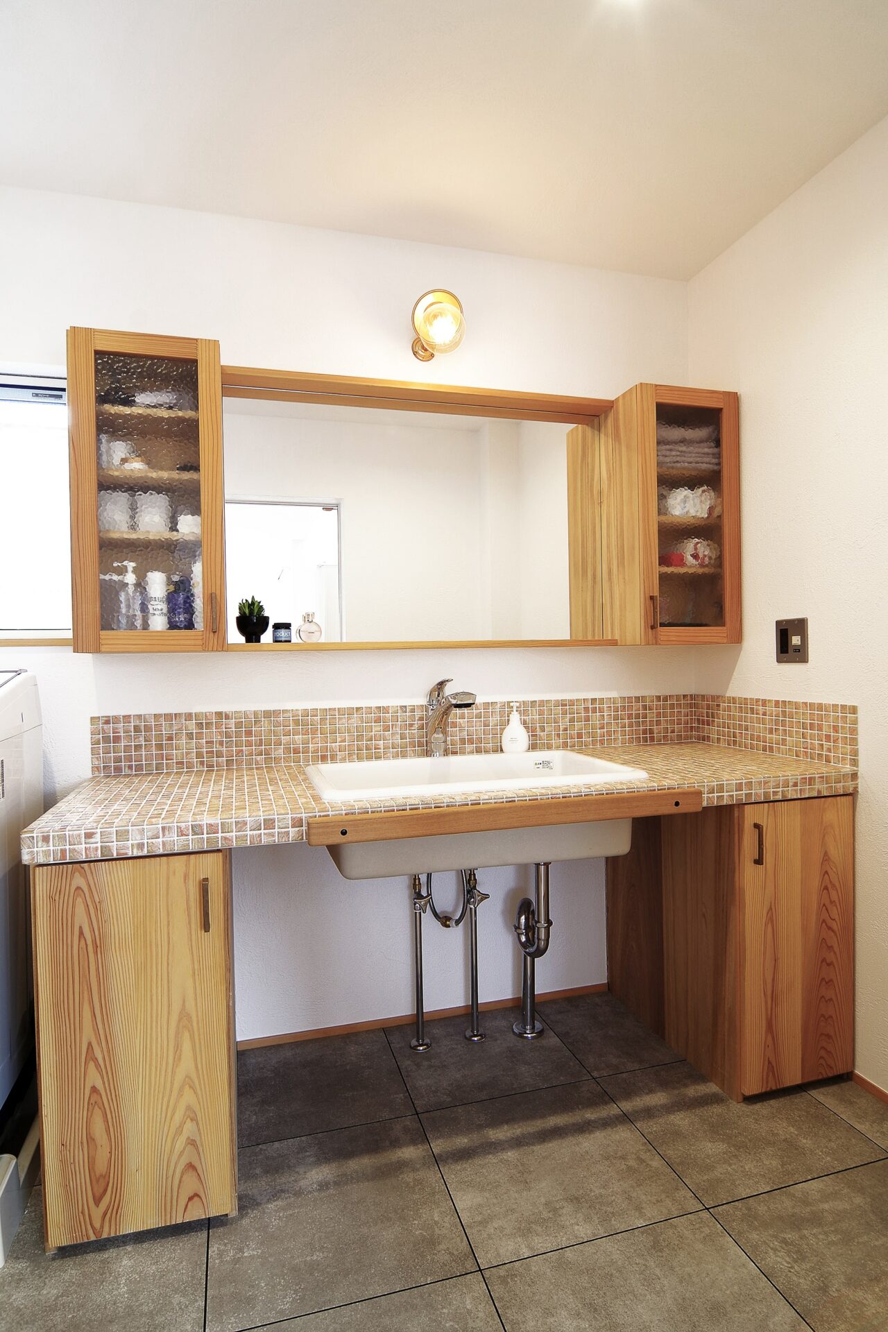自社家具工房のオリジナル洗面化粧台。並んで朝の支度ができるゆったりとしたサイズです。