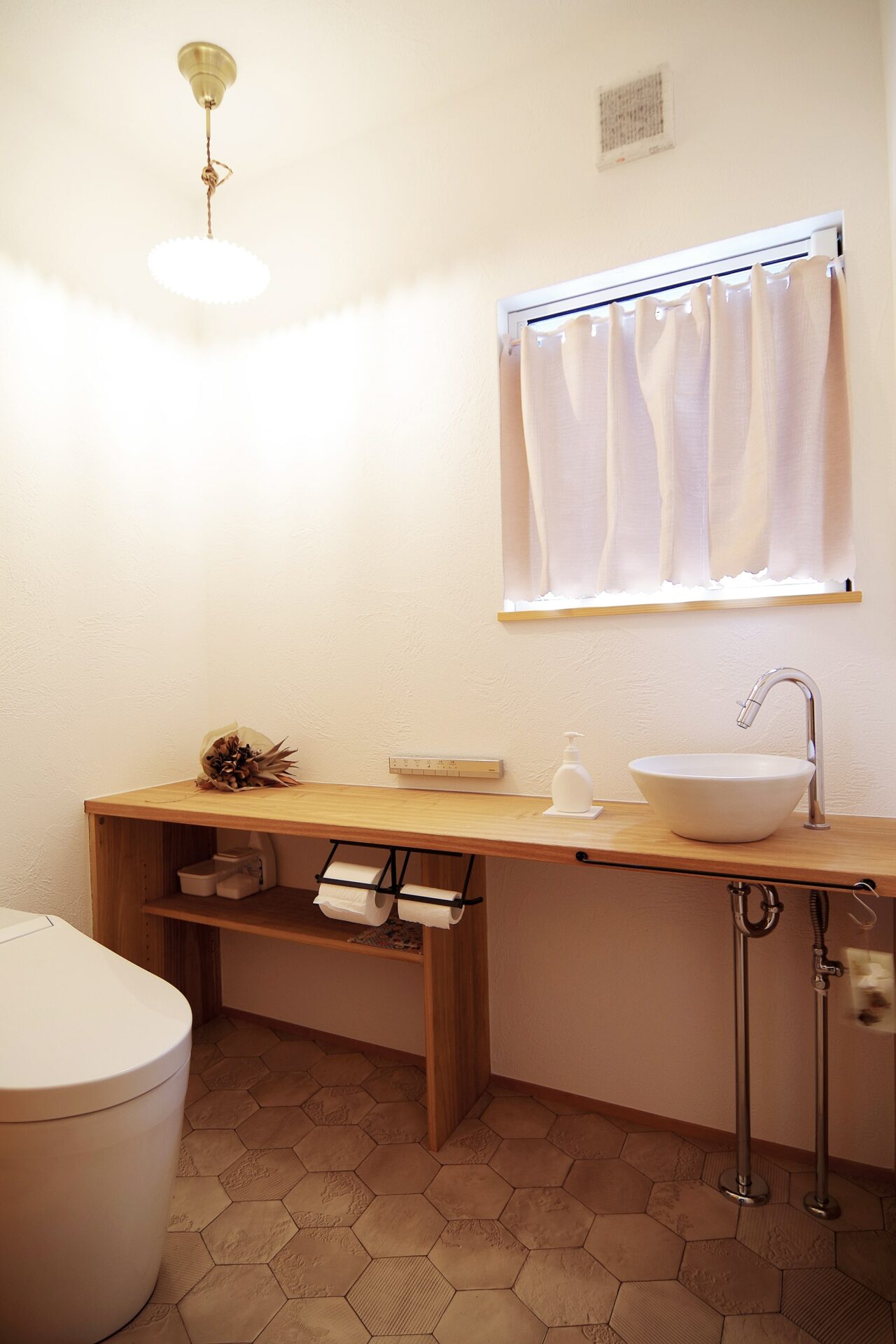 自社家具工房で作られた無垢材の手洗いカウンターです。