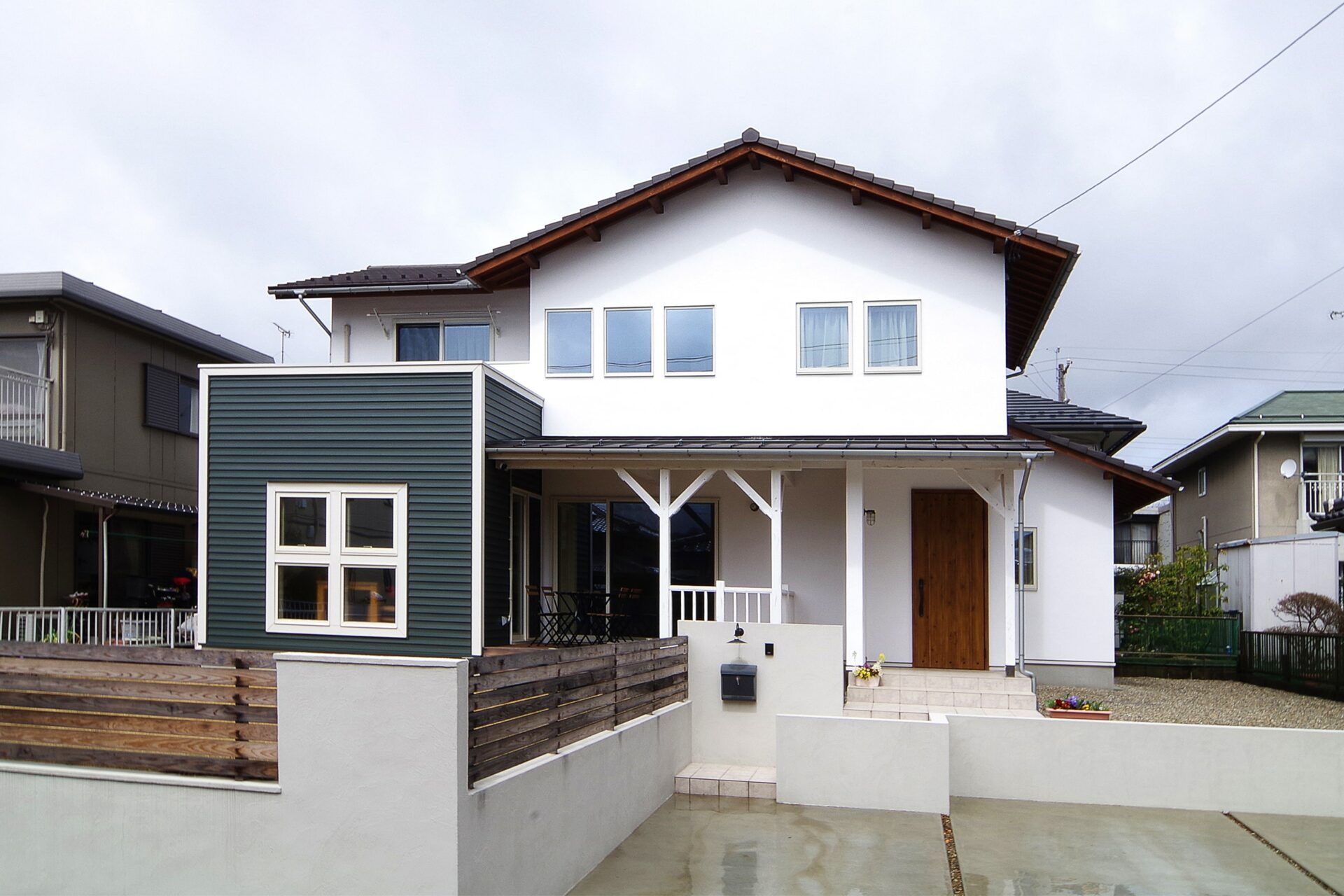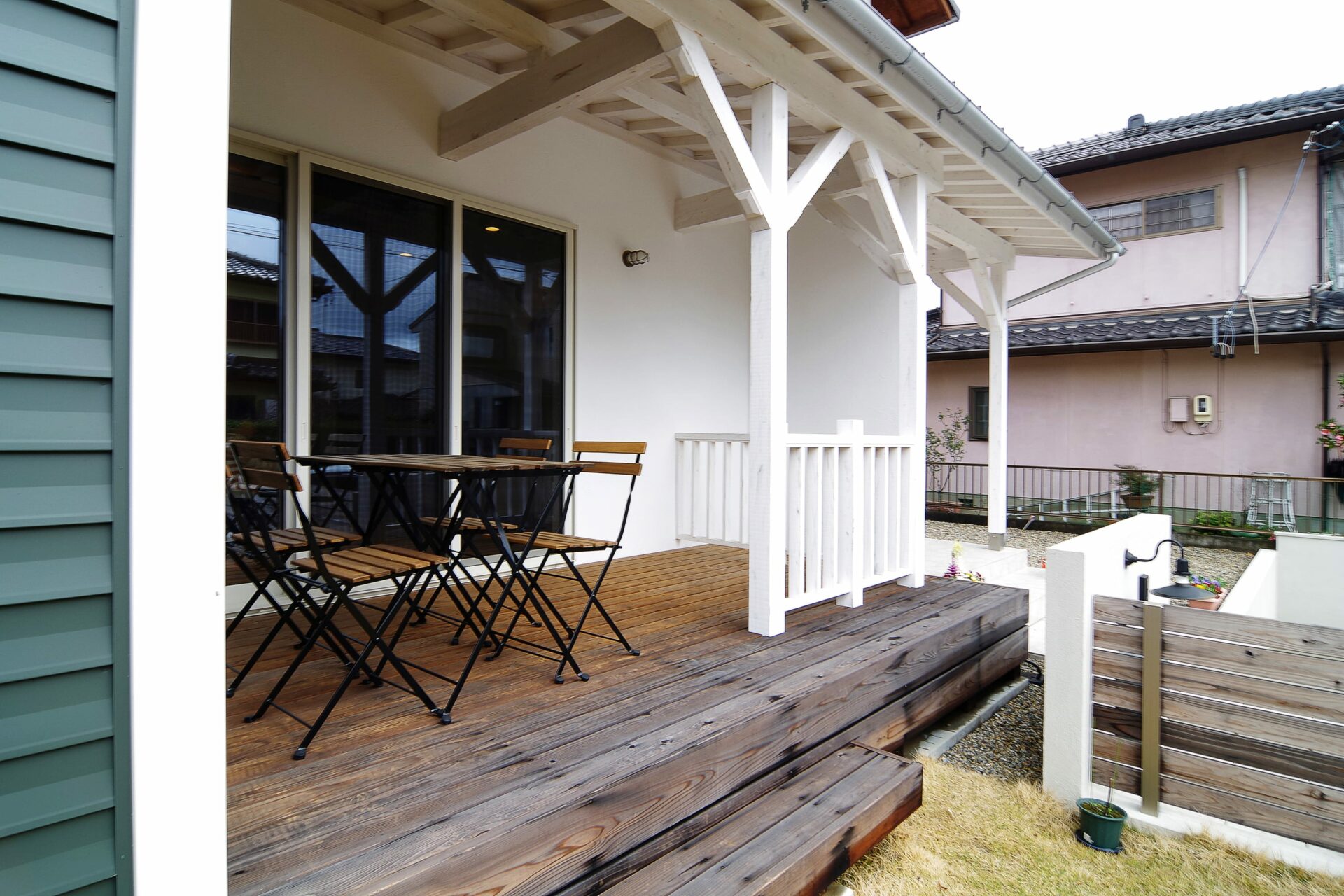 広めのウッドデッキ(ラナイ)のある北欧スタイルの外観です。リビングとフラットに繋がる、広い屋根付きのウッドデッキでは、オープンカフェ気分でお茶やお食事をしたり、ハンモックに揺られたり思い思いの使い道を愉しめます。