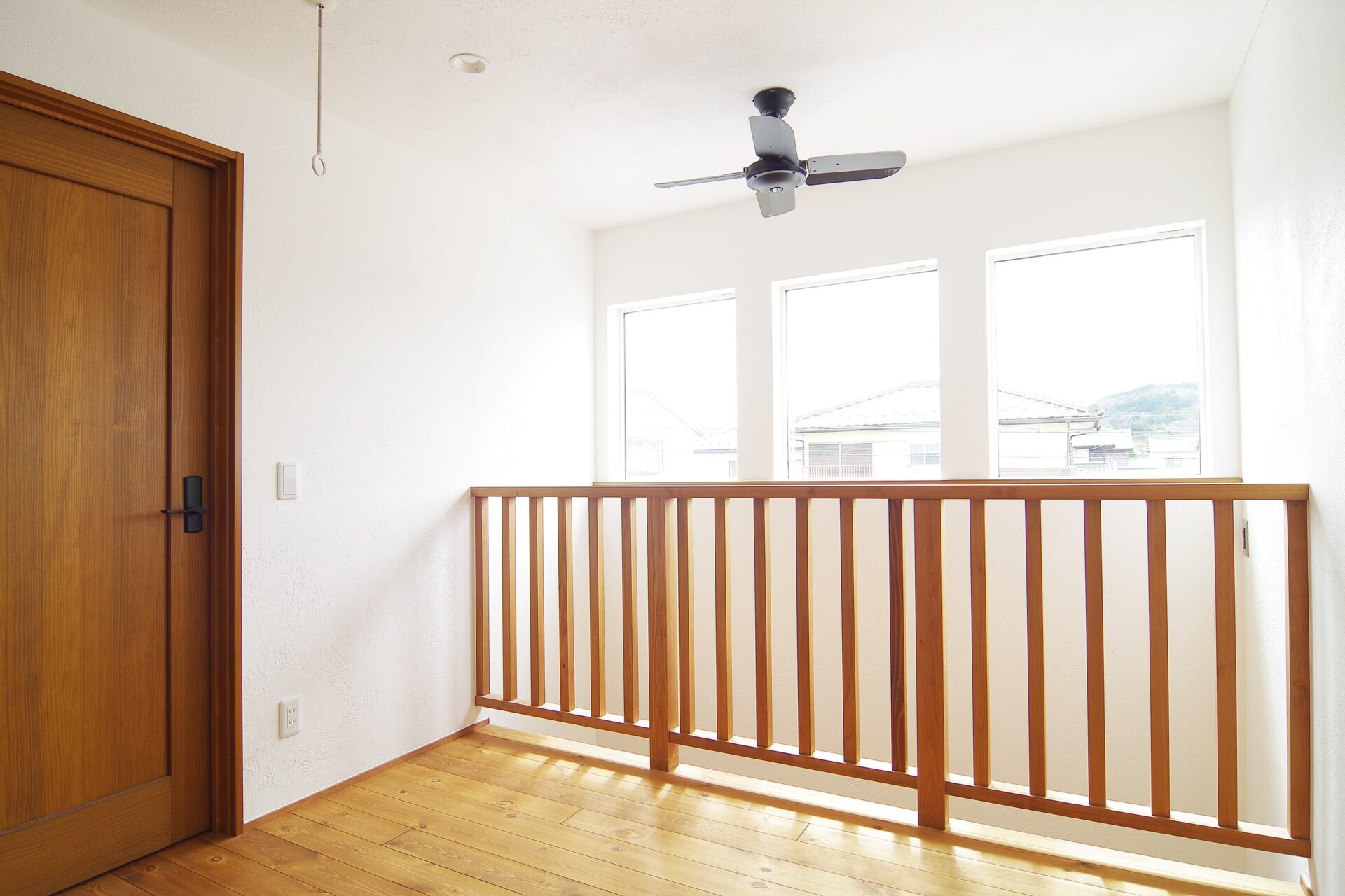 二階にのポーチに部屋干しスペースを設置。吹抜けや窓のおかげで乾きやすく、とても便利だそう。