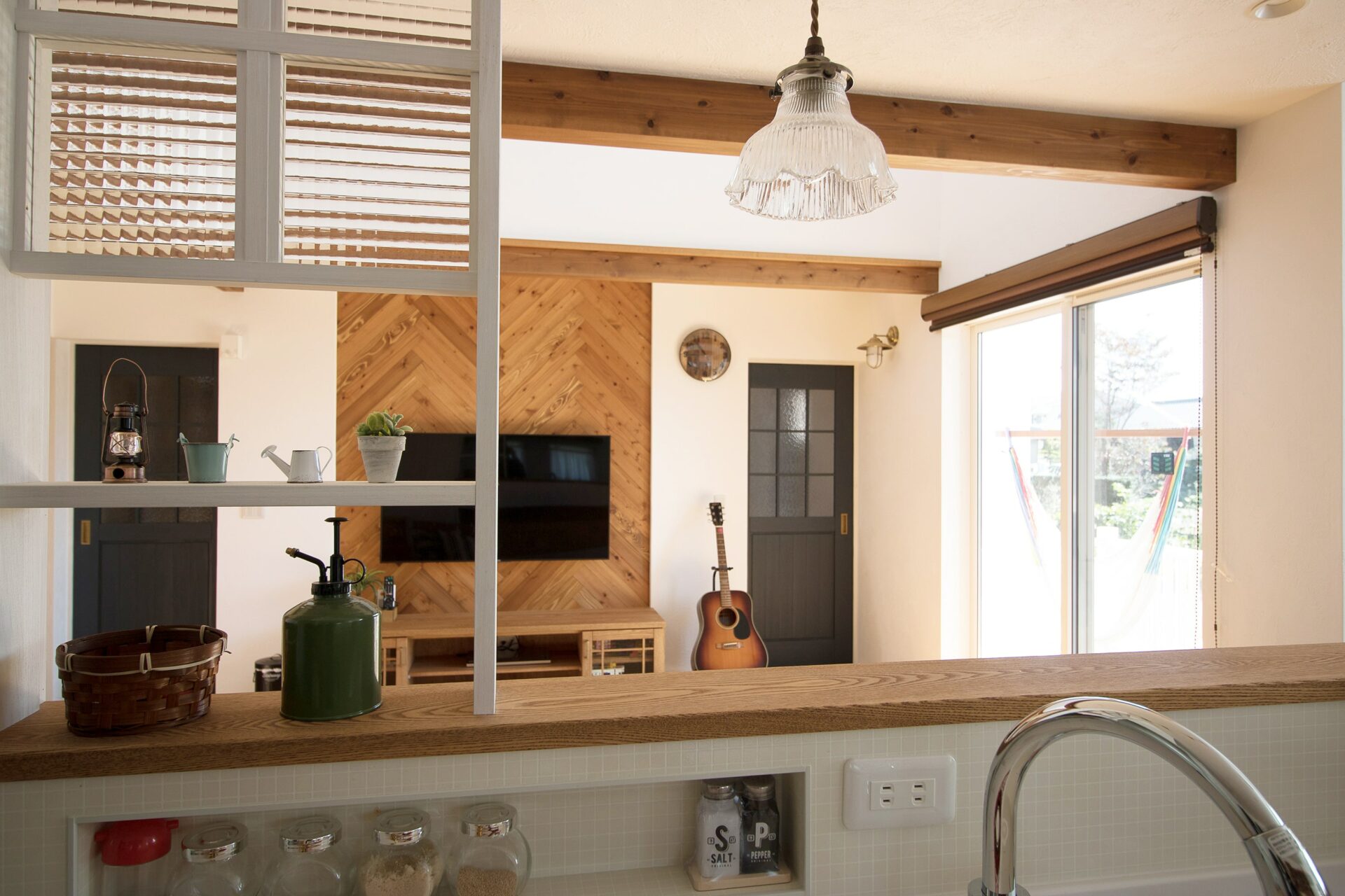ご主人様のイメージは各務原展示場のようなラナイやTV背面のヘリンボーン、奥様はアンティークでかわいい雰囲気をイメージし、それぞれこだわる場所を決めることで一体感のある空間を作りあげました。