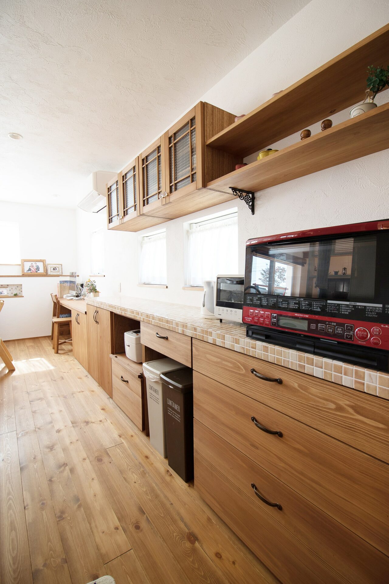 キッチンキャビネットはこんなことも。天板をナチュラルピンクのモザイクタイルで可愛らしい仕上がりに。無垢材の質感を組み合わせた造作です。