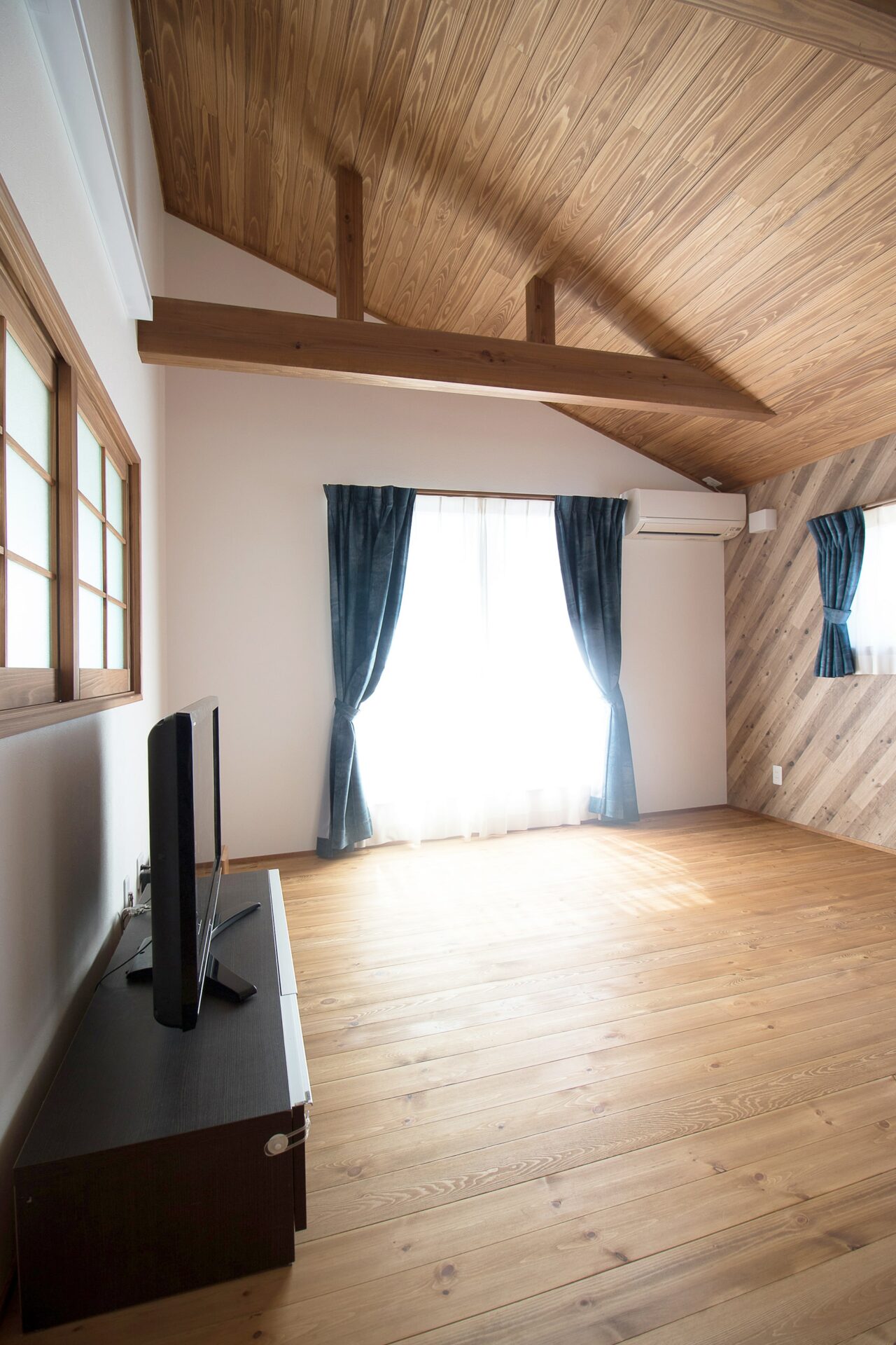 ご主人様はラナイと寝室がこだわり。ログハウスのような無垢の香りが存分に味わえるアウトドアな雰囲気になりました。
