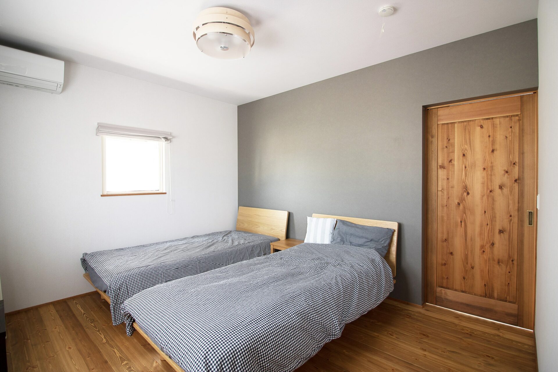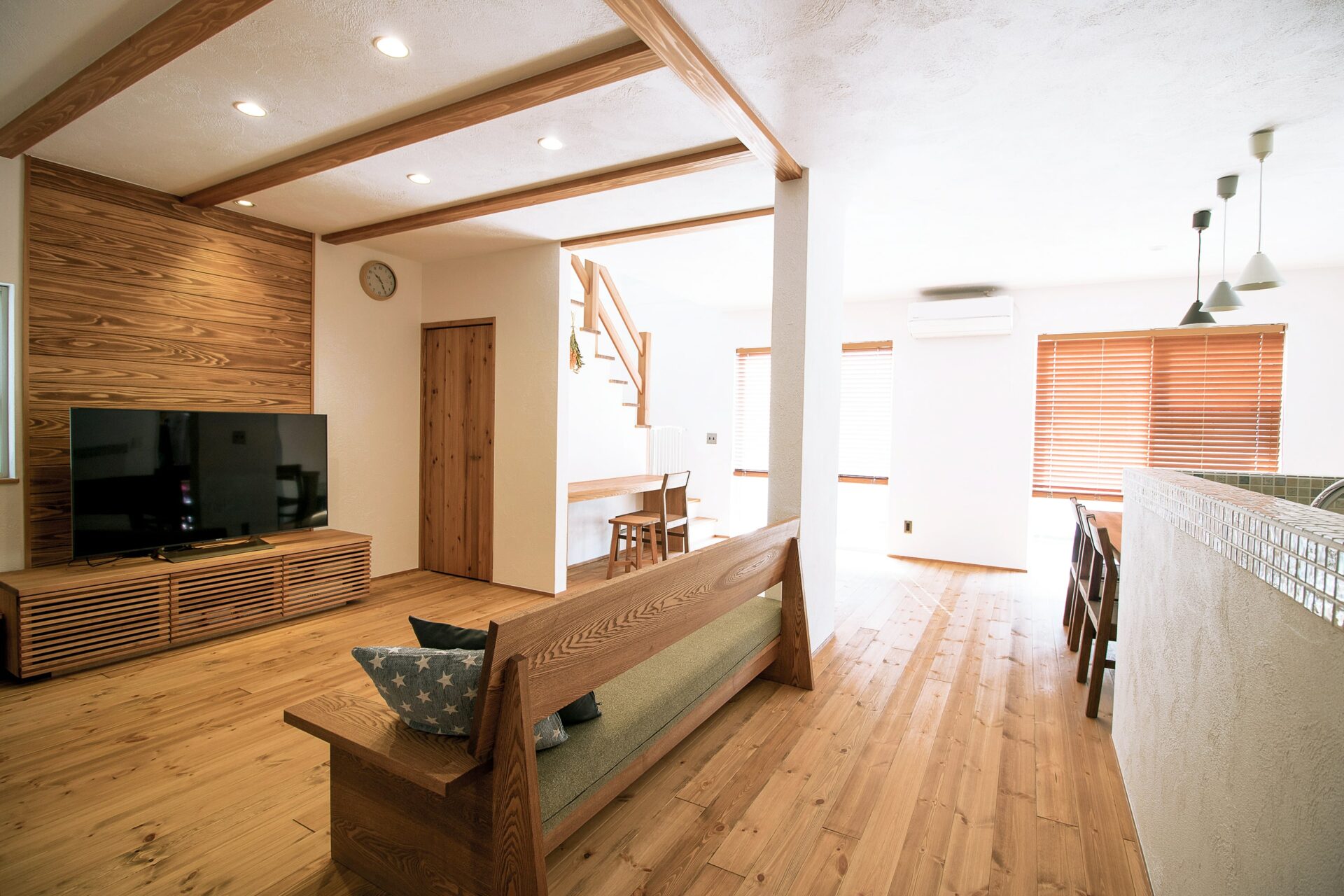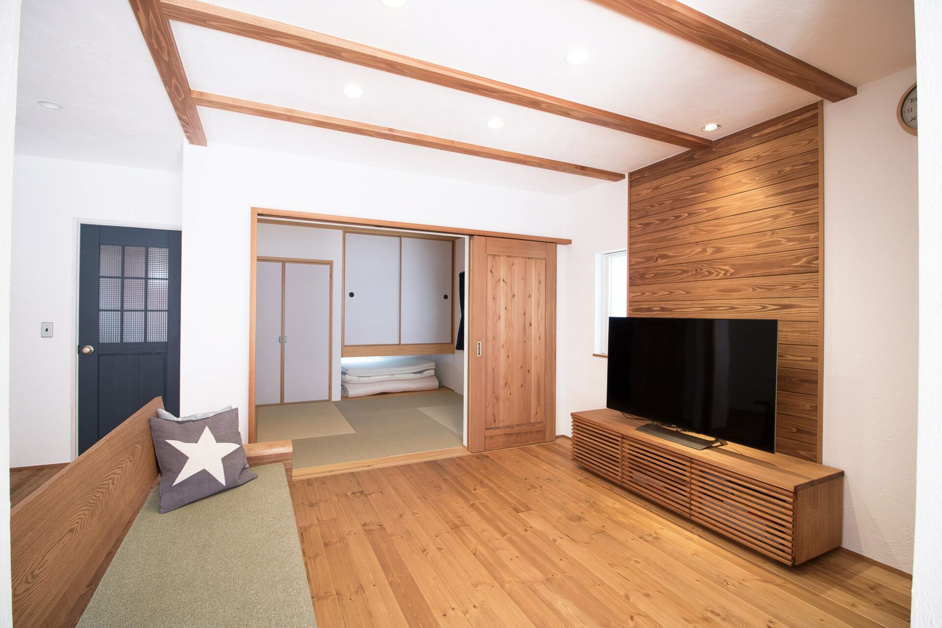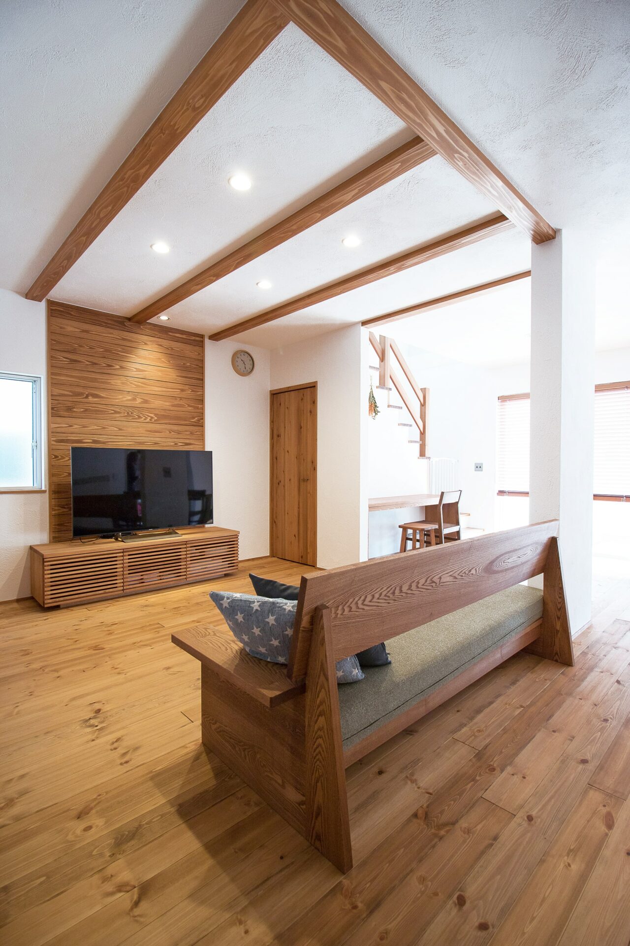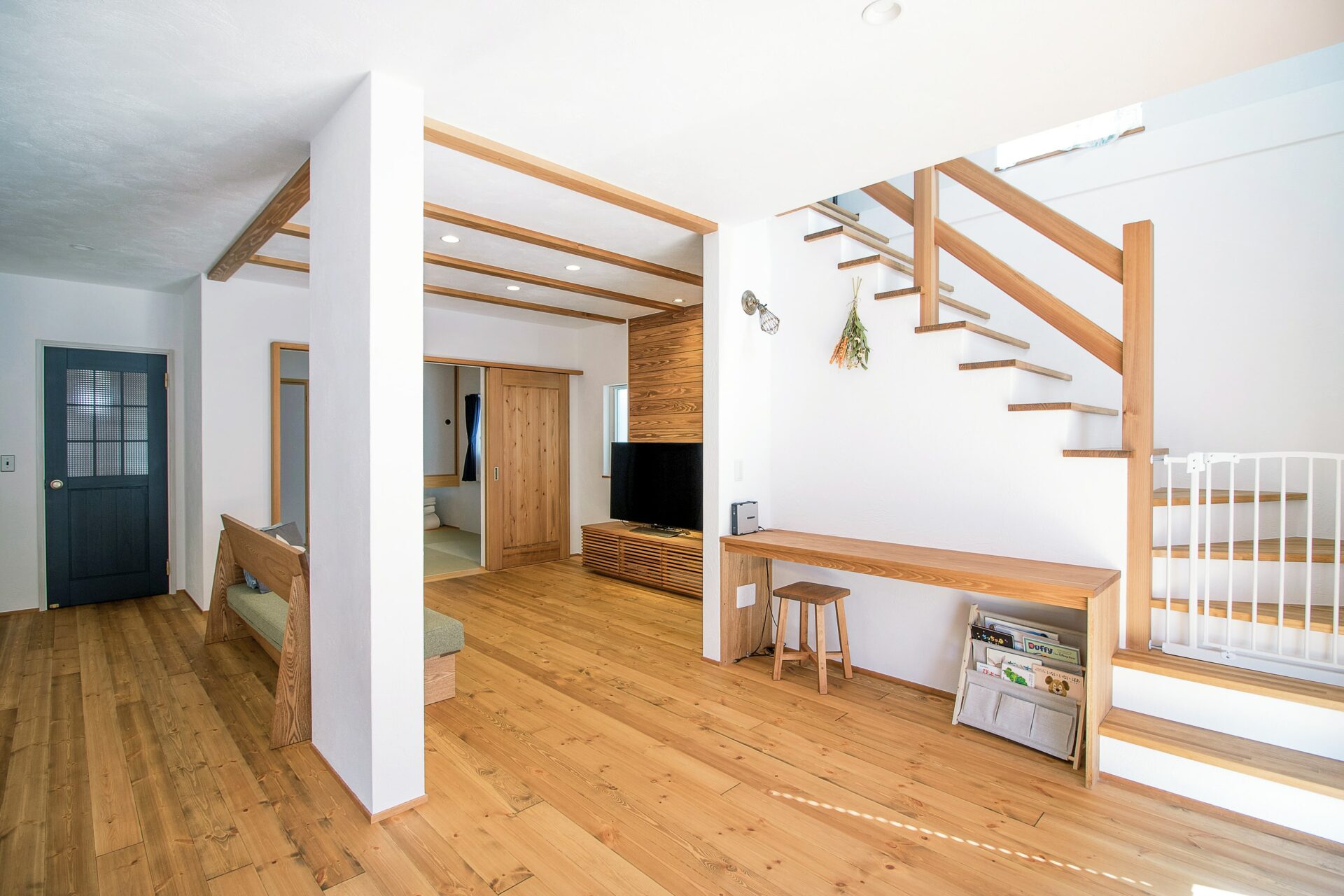 家族みんなで過ごせる2Fのファミリールームや子ども部屋・寝室のアクセントクロス、タイルや照明、TV背面の無垢板張りなど、デザインにもこだわりました。