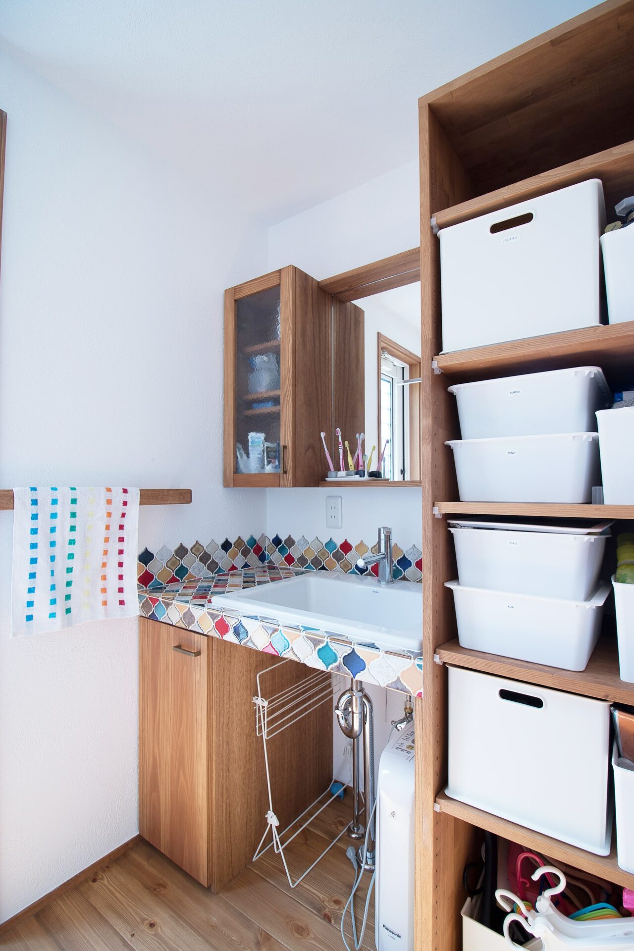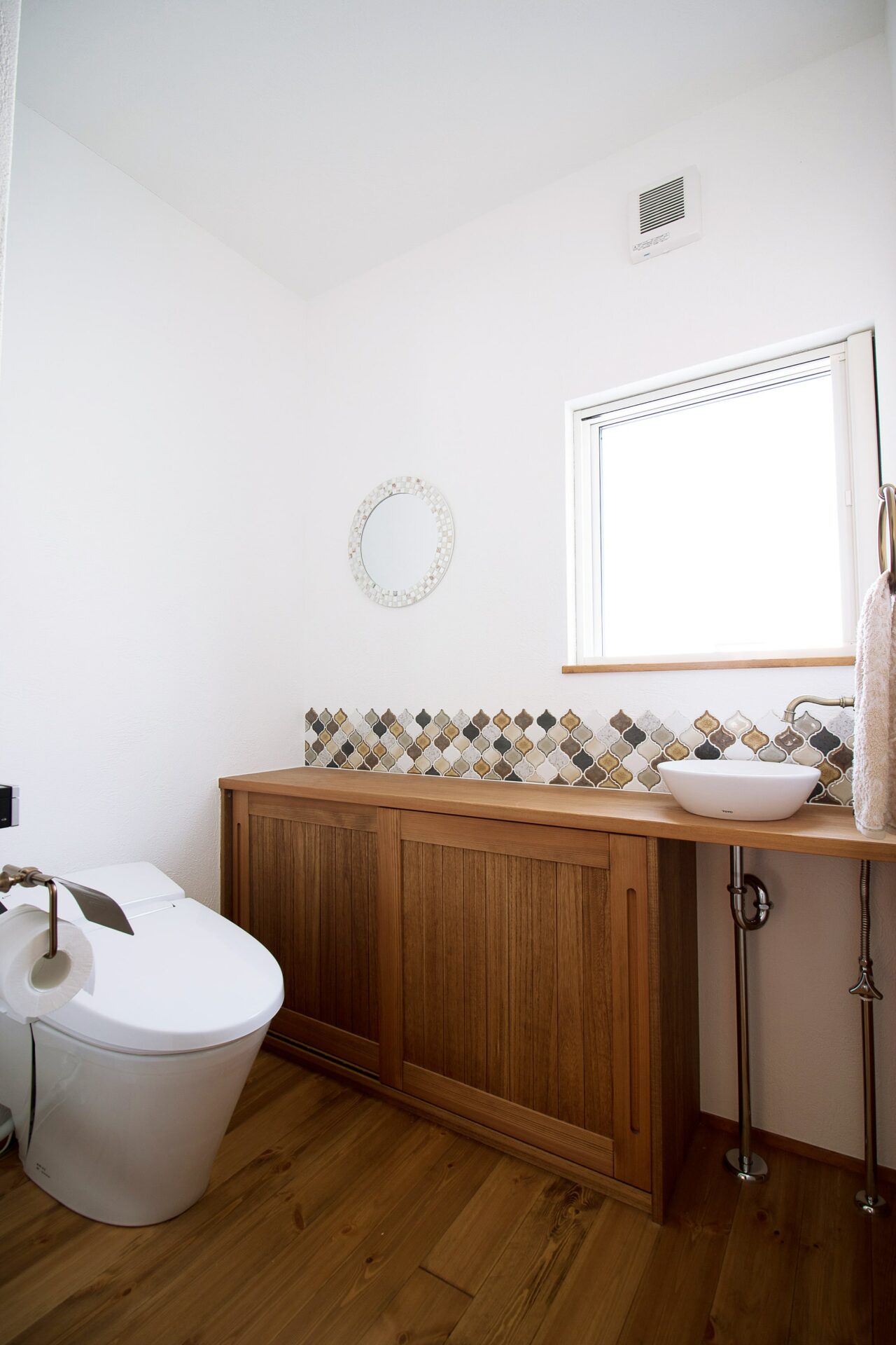 洗面化粧台やトイレ手洗いにはオーナー様お気に入りのコラベルタイルで、毎日の生活に彩りを与えてくれます。 ※家具や建具は無垢ストーリーでつくられたオリジナルです。
