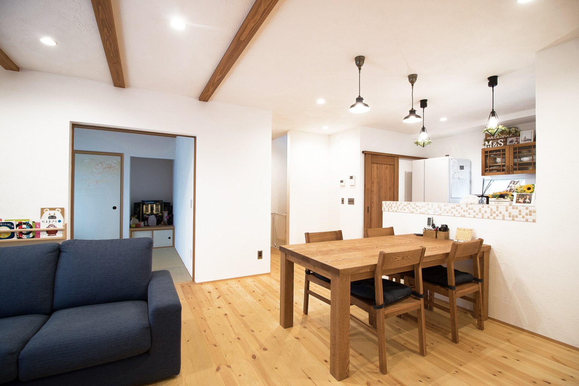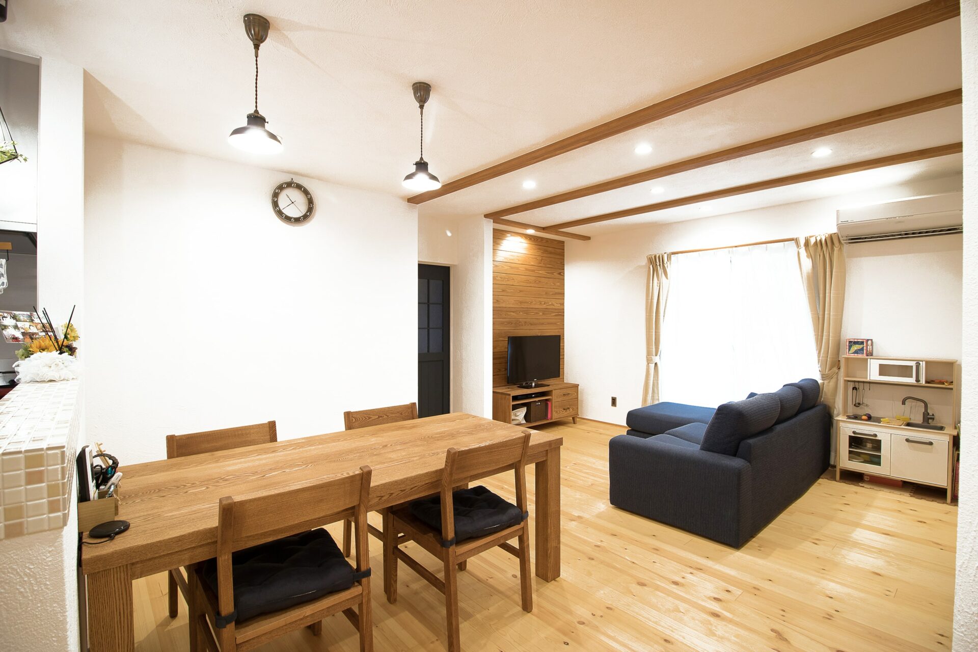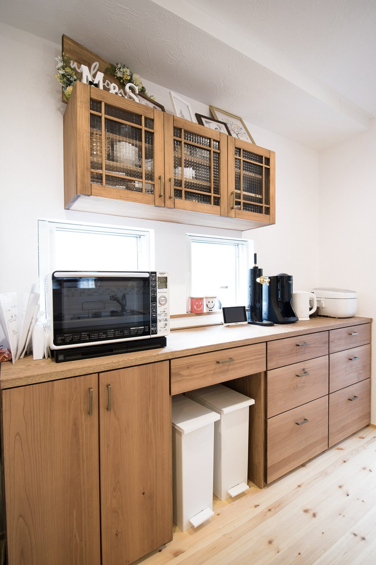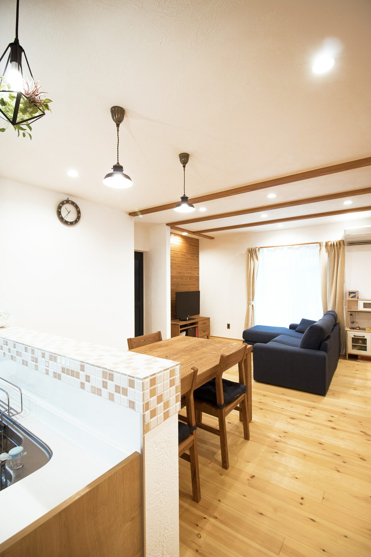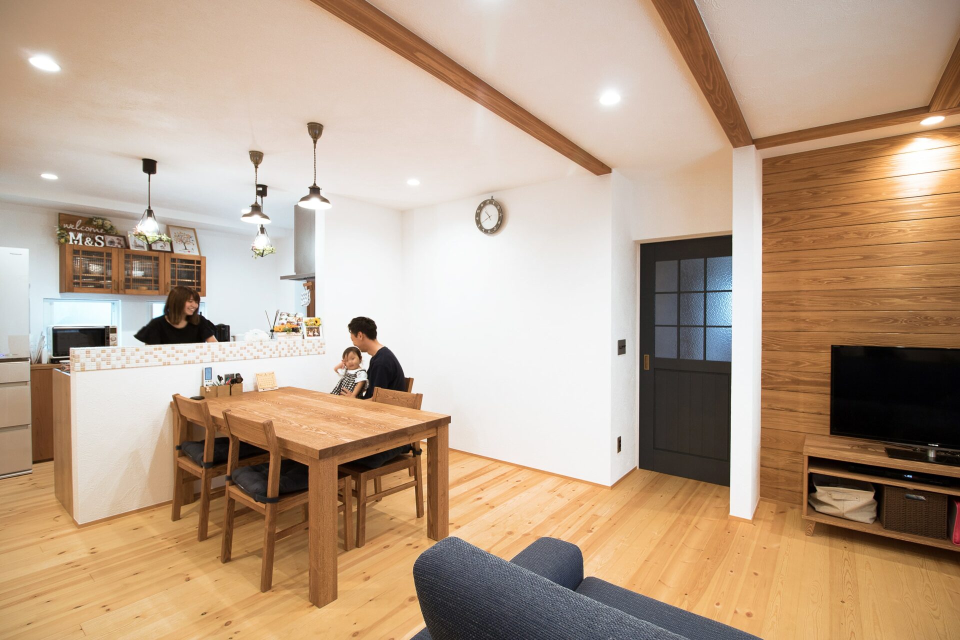 「漆喰と無垢材という自然素材の雰囲気が可愛くて、温かい家にしたかった私たちにピッタリでした」と話してくれました。TV背面には木の温かみが感じられるように板を貼り、アクセントウォールに。普段キッチンに立つ奥様は、収納の使い勝手にこだわりました。