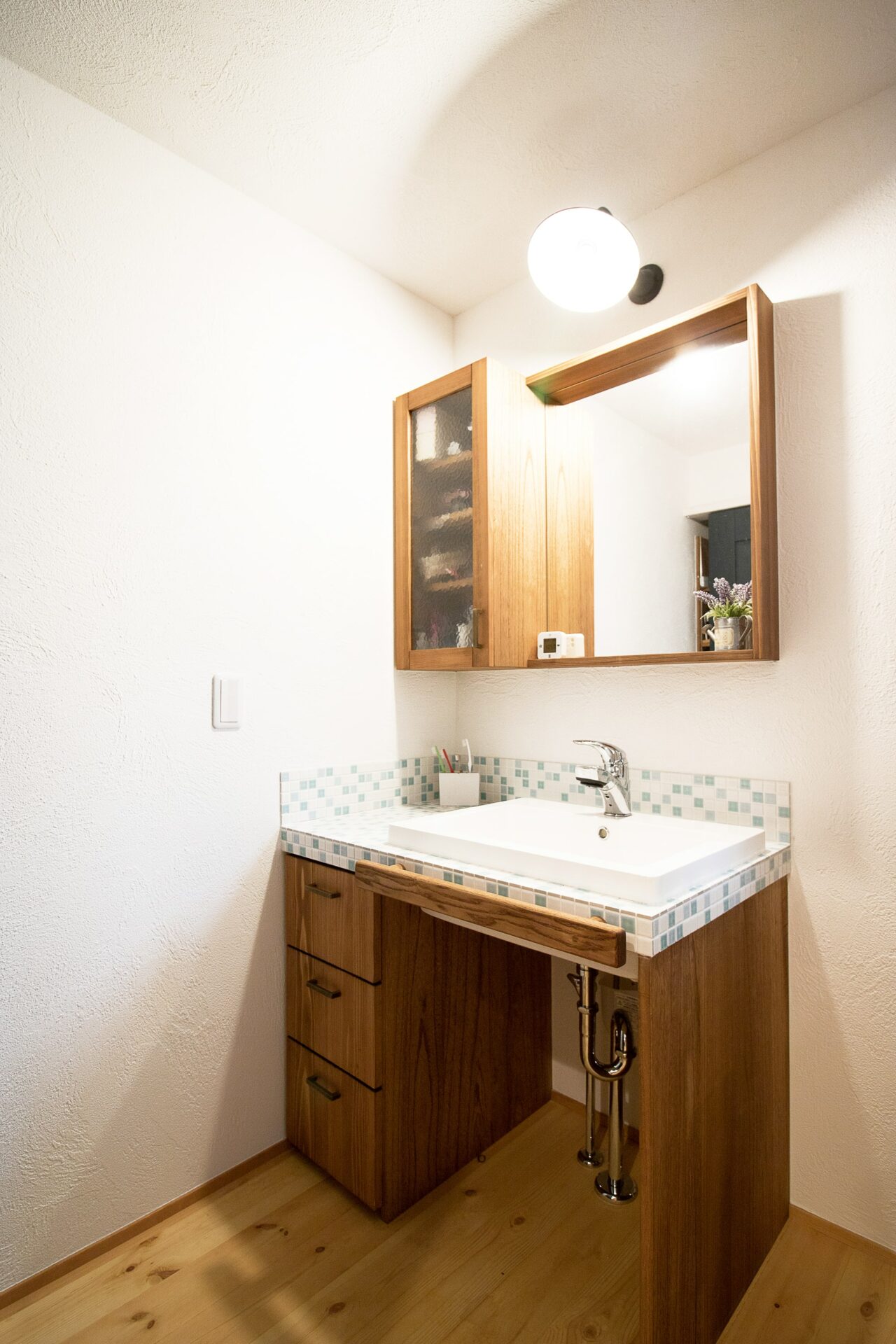 ナチュラルピンクのキッチンタイルに明るいキャメル色に塗装した無垢家具がピッタリ。落ち着いた可愛らしさで、家族との食事も楽しくなります。 ※家具や建具は無垢ストーリーでつくられたオリジナルです。