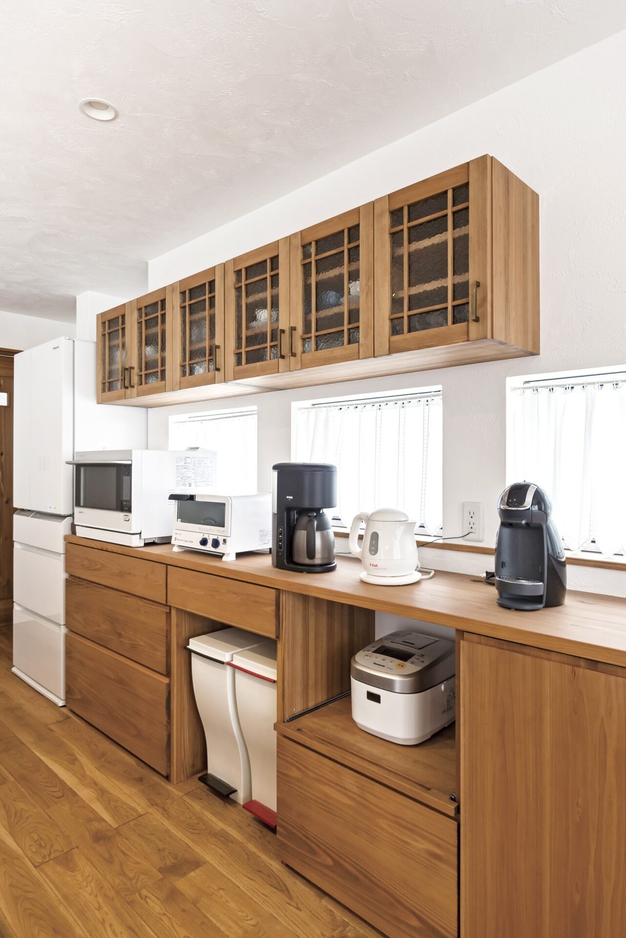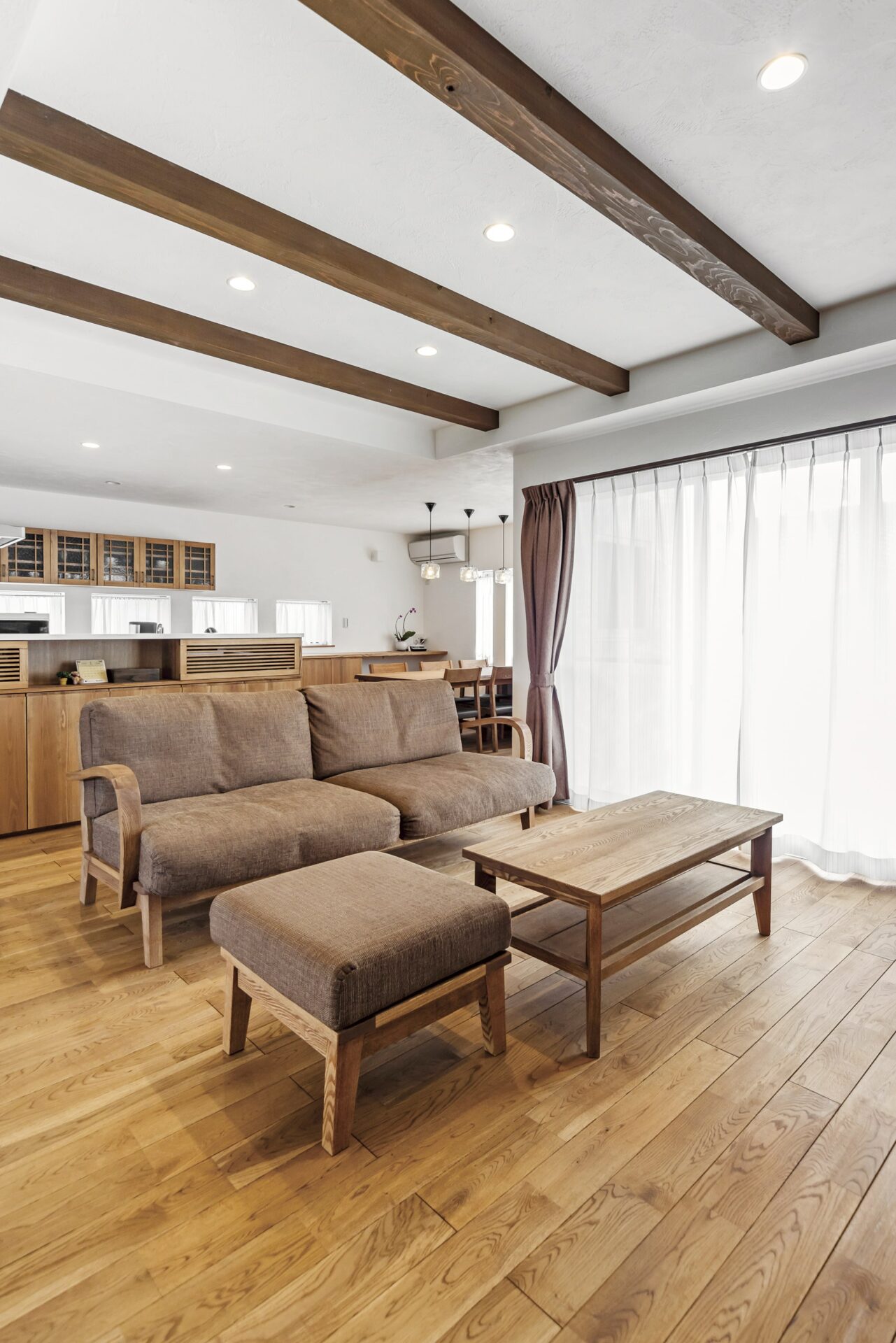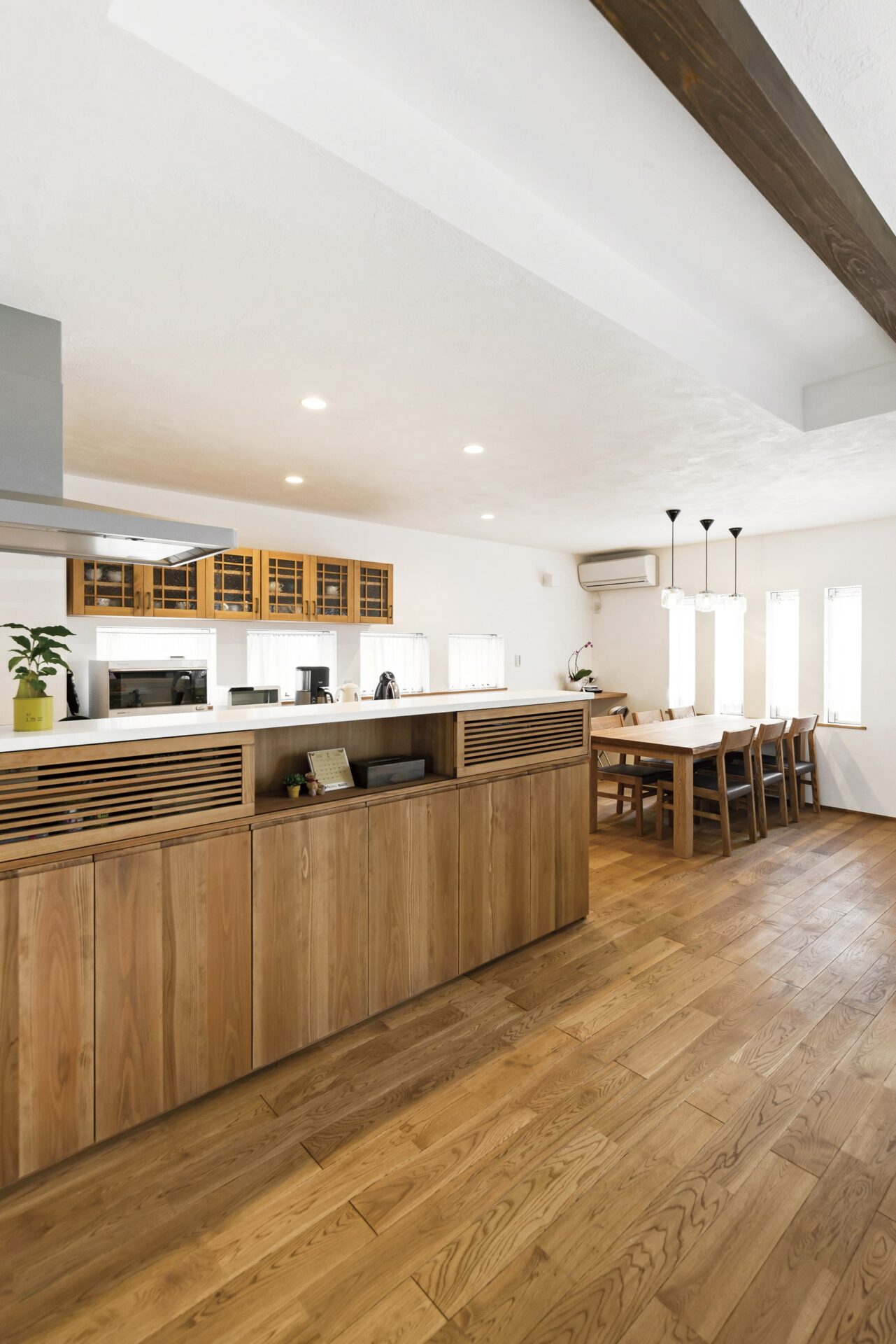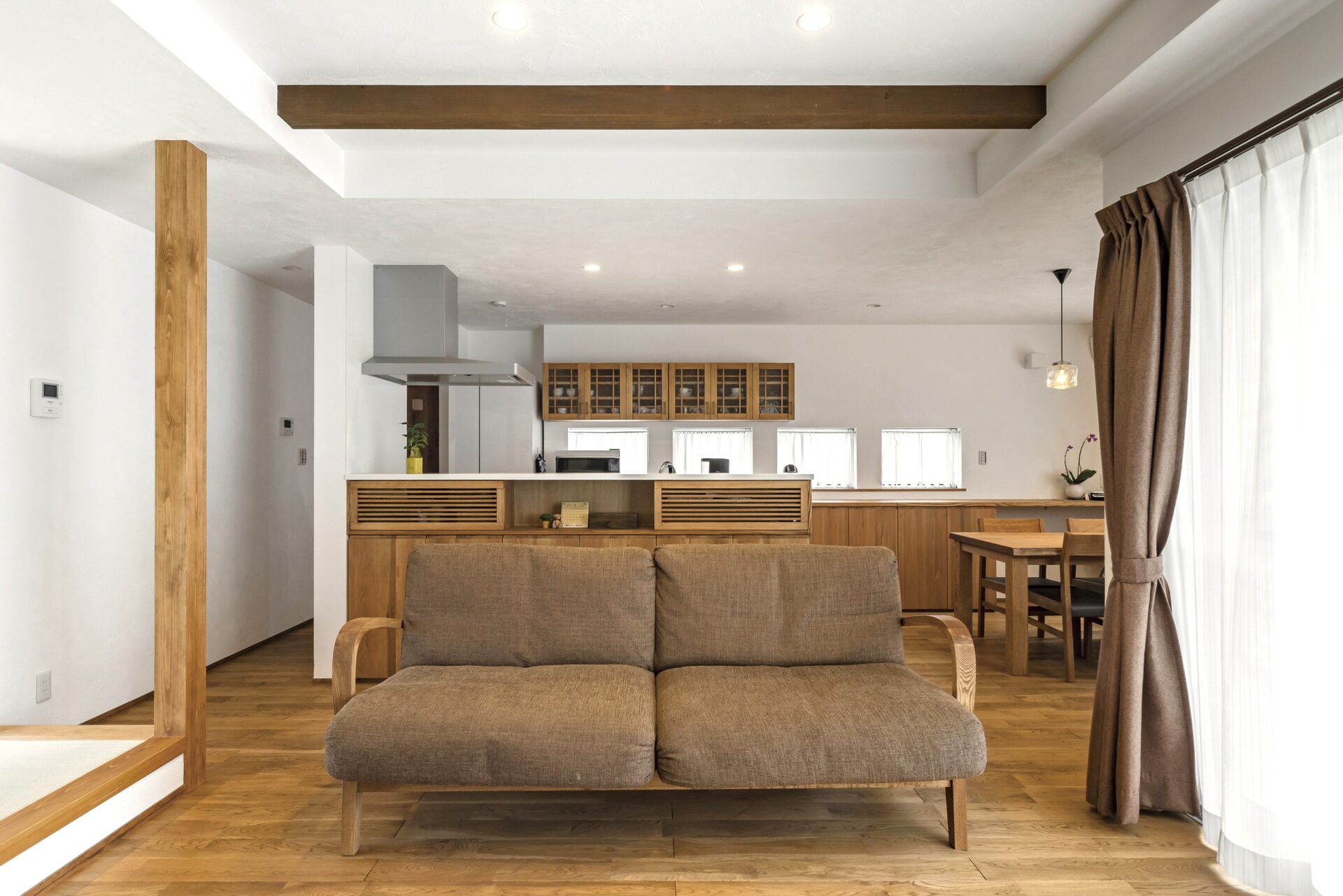 オーガニックカフェのような、どこどなく和の雰囲気も感じさせる愛知県小牧市のI様邸。寝ころびたくなるような無垢の床と木目の美しい家具や建具。お洒落でありながら、味のある木を上手に使った空間が心を落ち着かせてくれます。