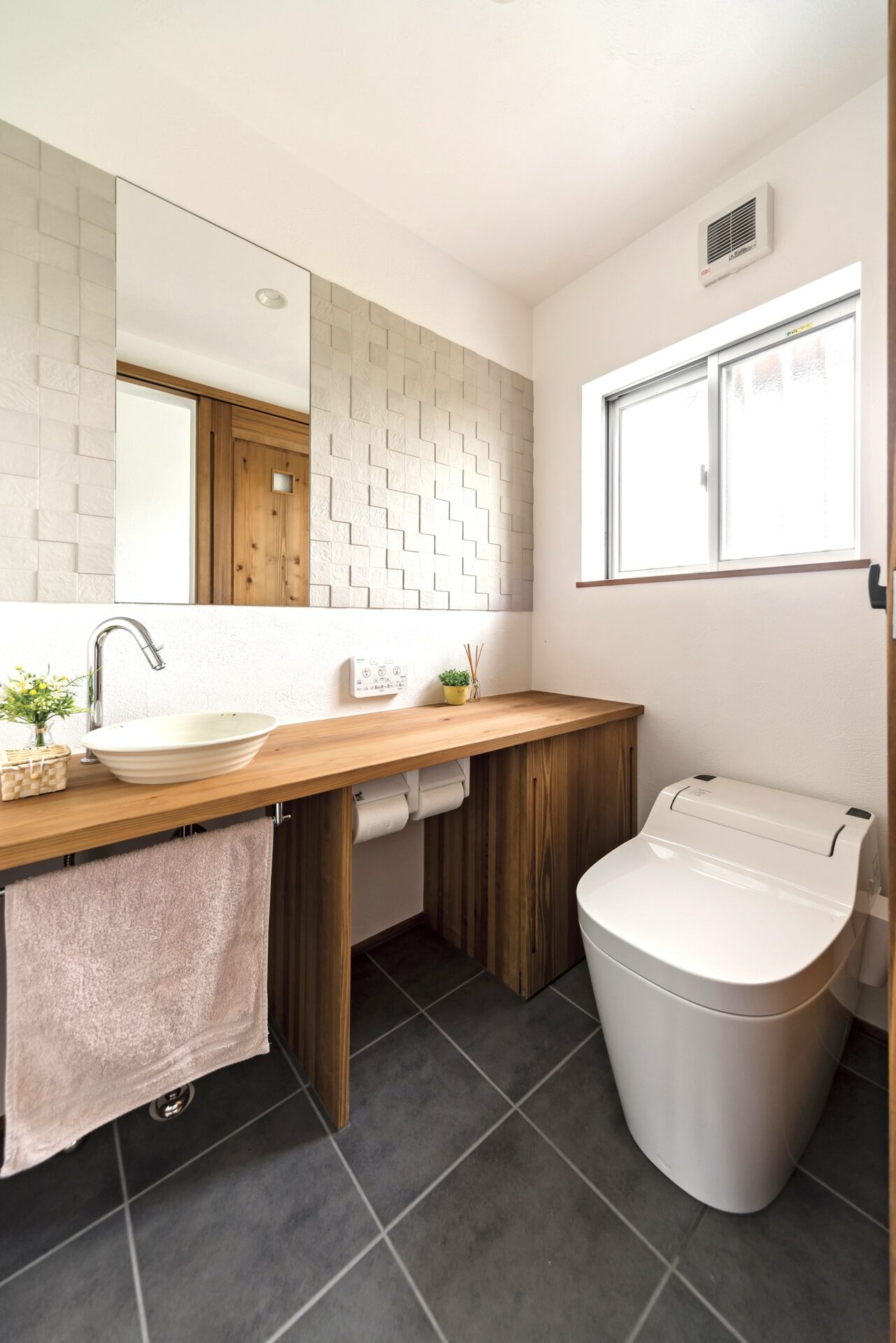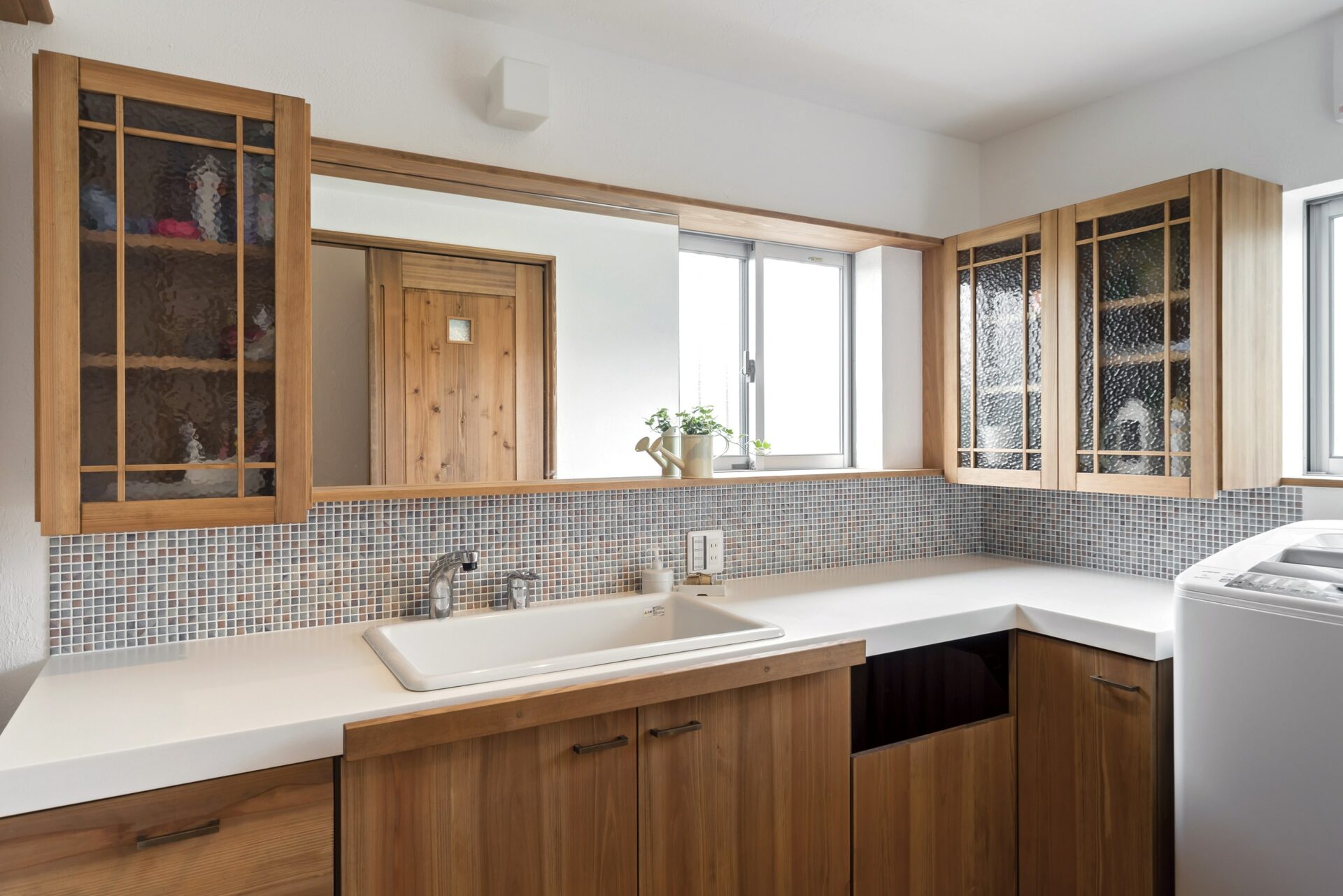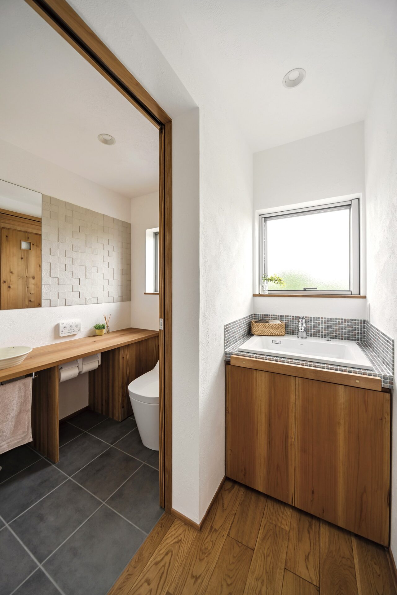 洗面化粧台は子どもが成長してもゆったり使えるようにとワイドなL型に。それぞれが化粧品などを置いて支度できるスペースを確保するため、あえてシンクは一つにするなど、将来の事まで見据えたこだわりが詰まっている注文住宅です。