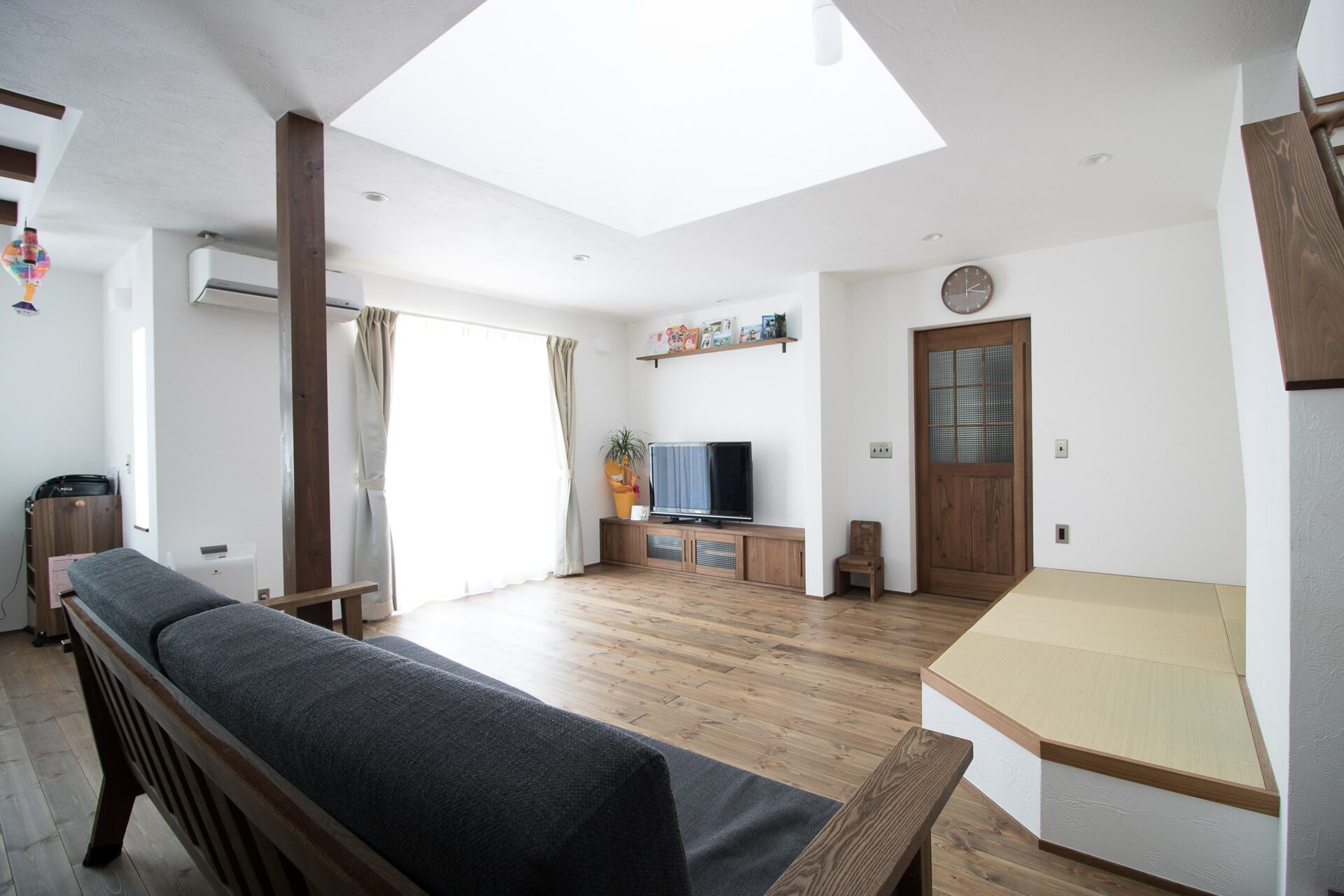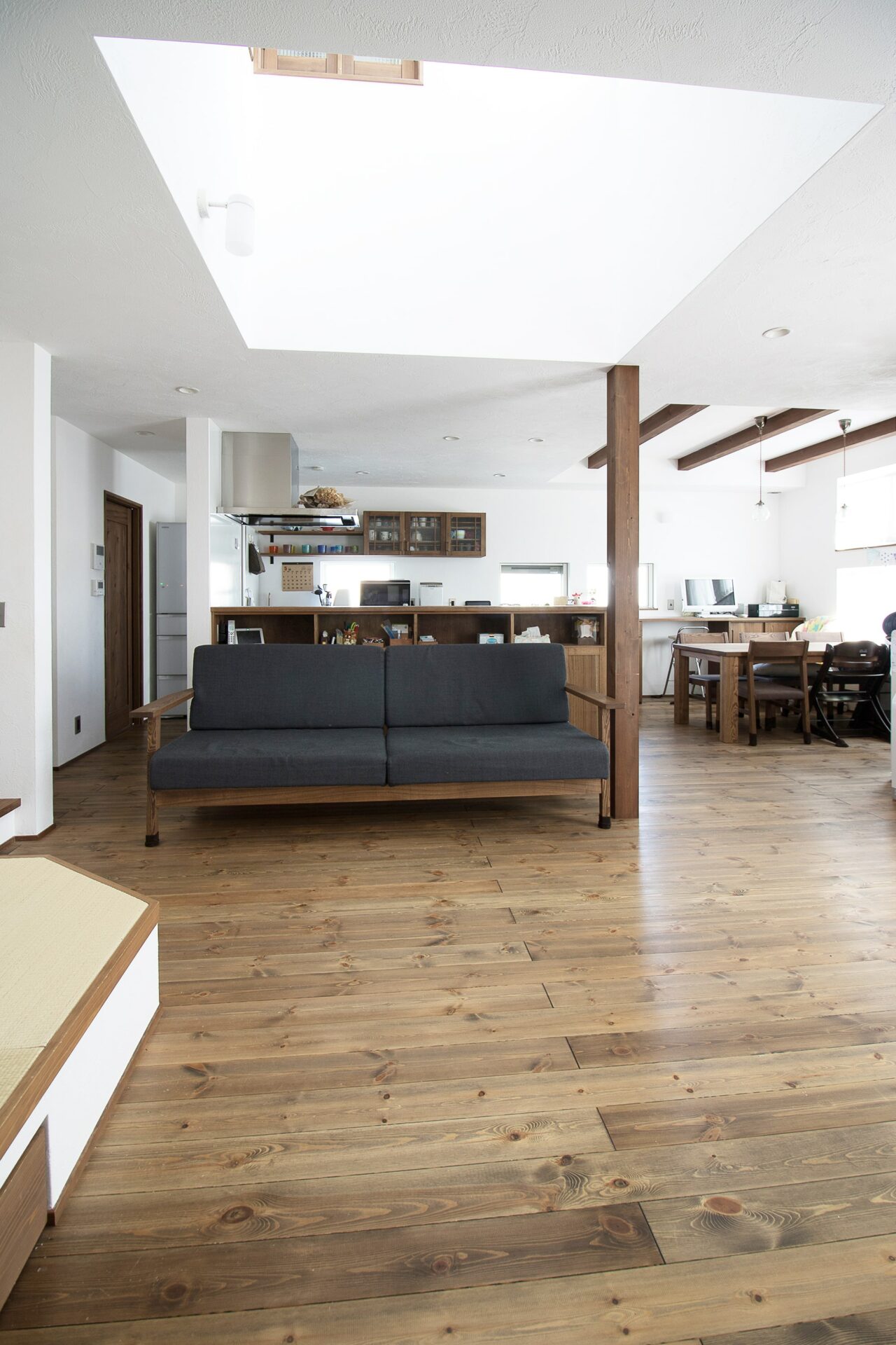吹抜けのおかげで明るく開放的なリビングでお子様は伸び伸びと走り回っています。