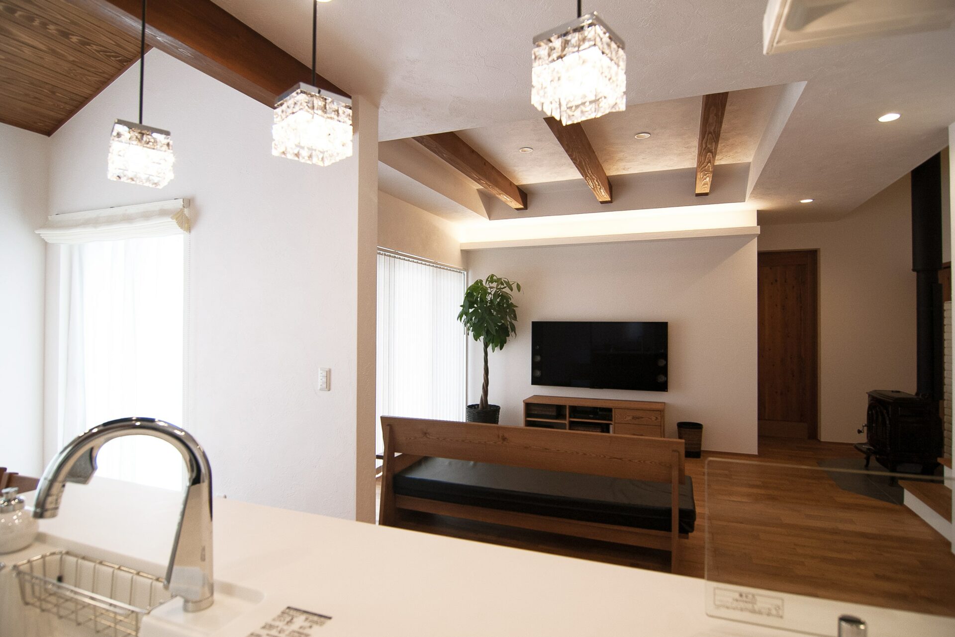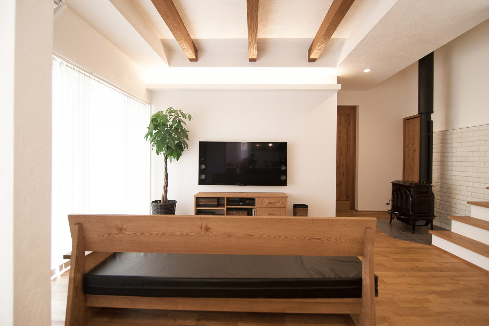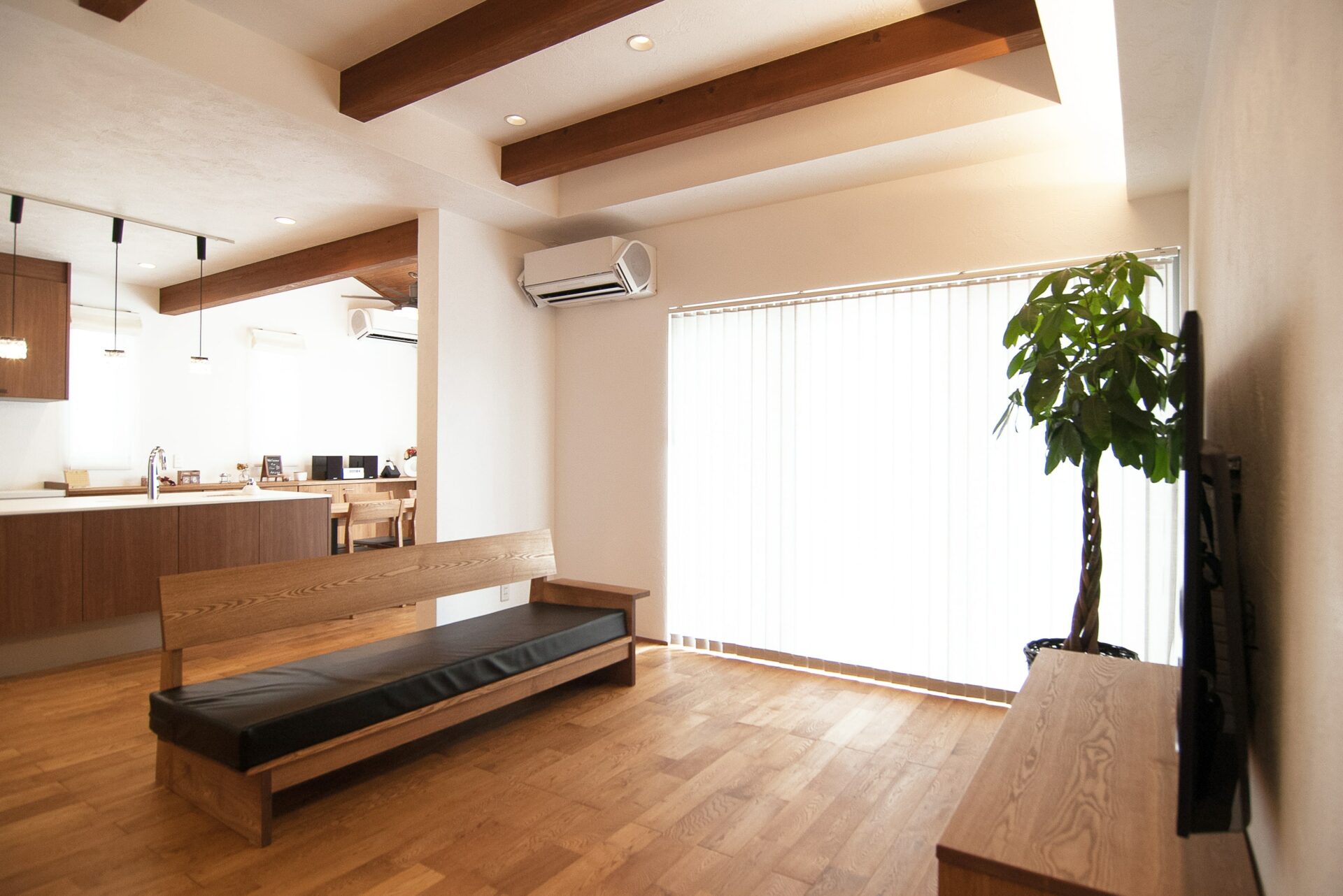 天井を一段高く上げて、構造材の梁をあえてむき出しに。空間をより広く開放的に見せてくれ、木目がデザインのアクセントにもなっています。シャープなラインのソファも自社で作られたもの。家全体を、落ち着きのある雰囲気に統一しました。