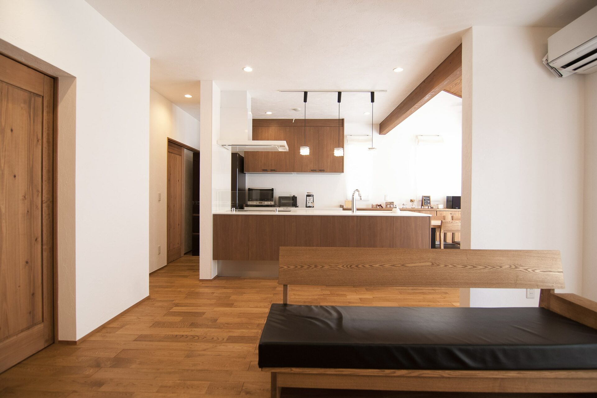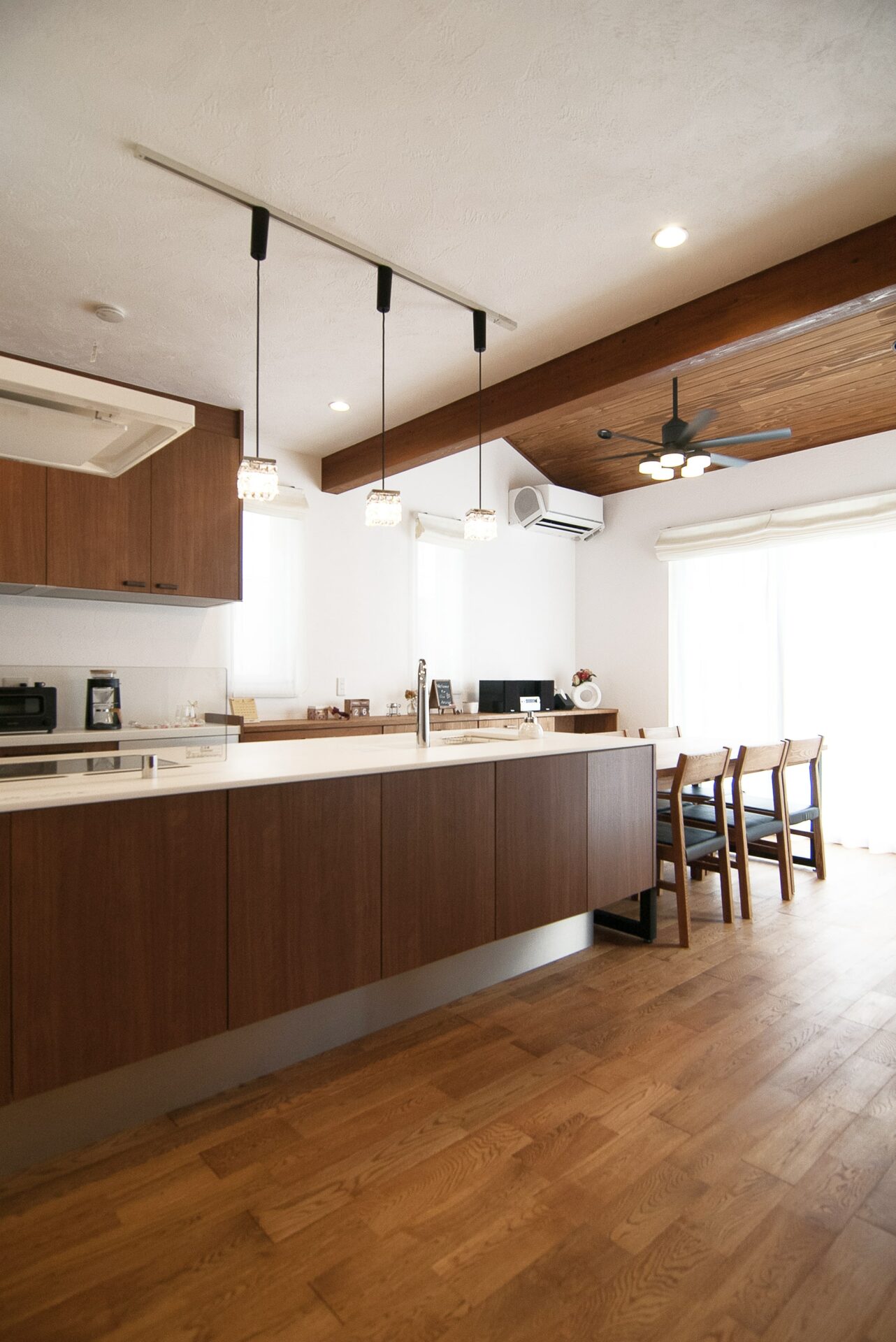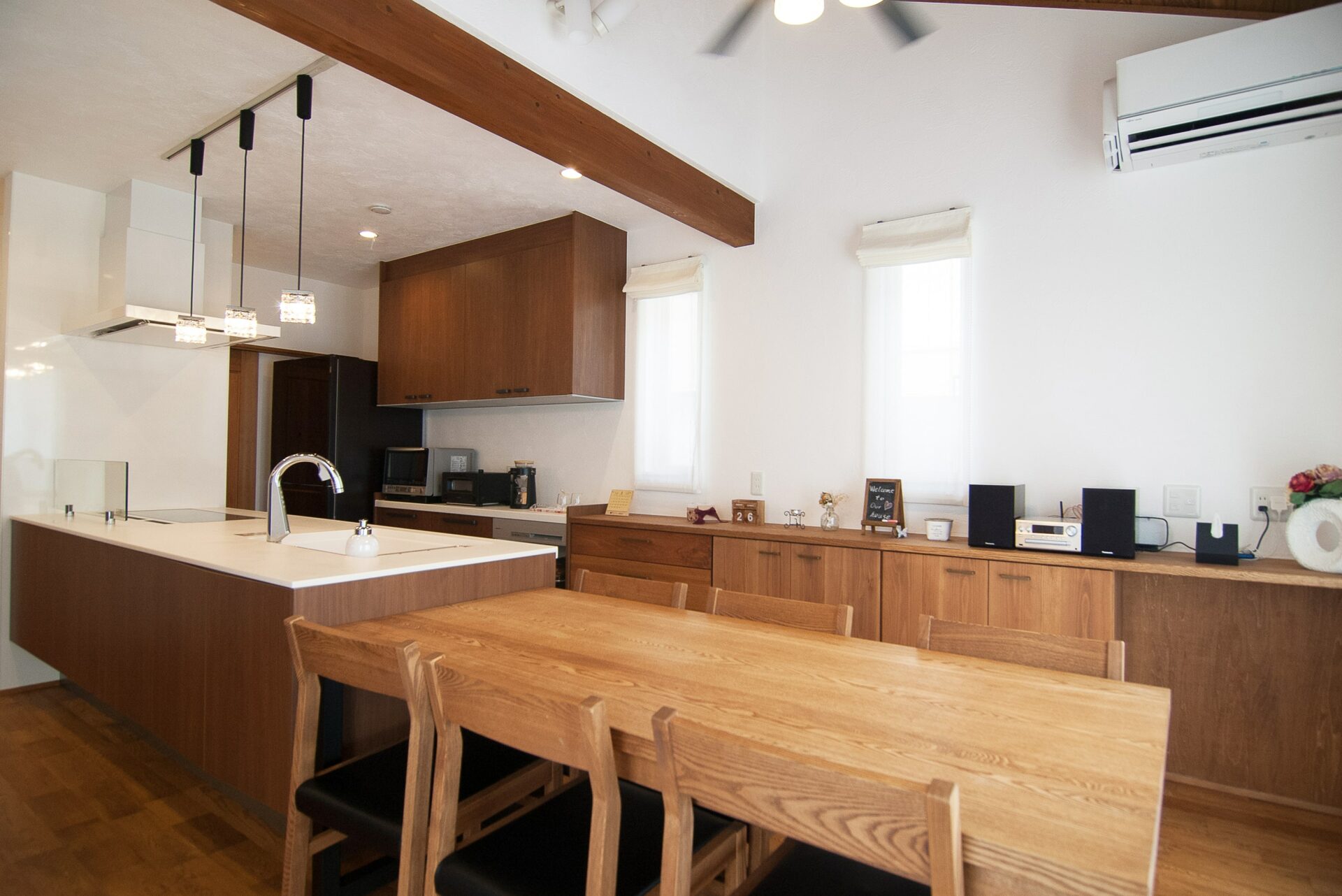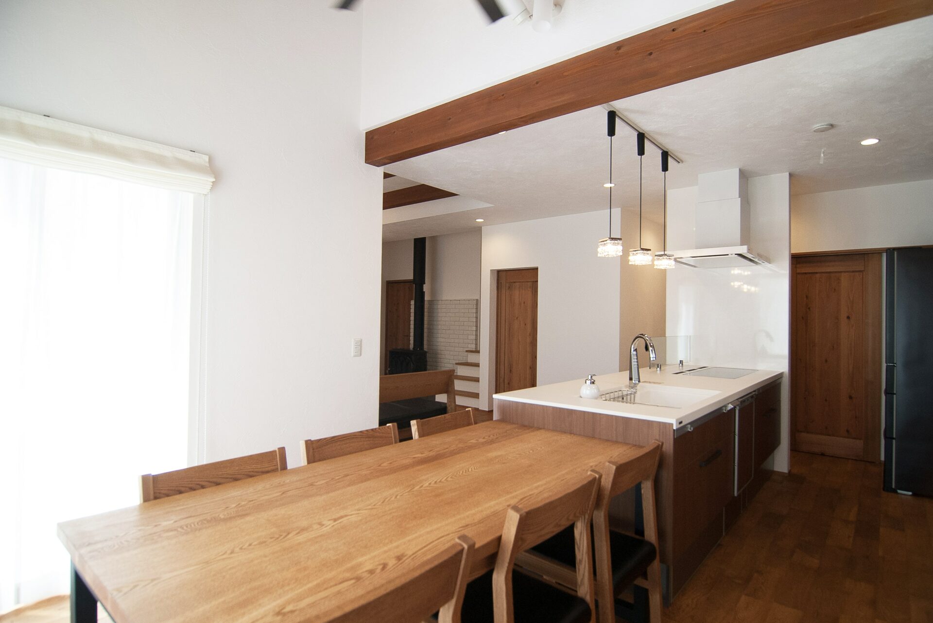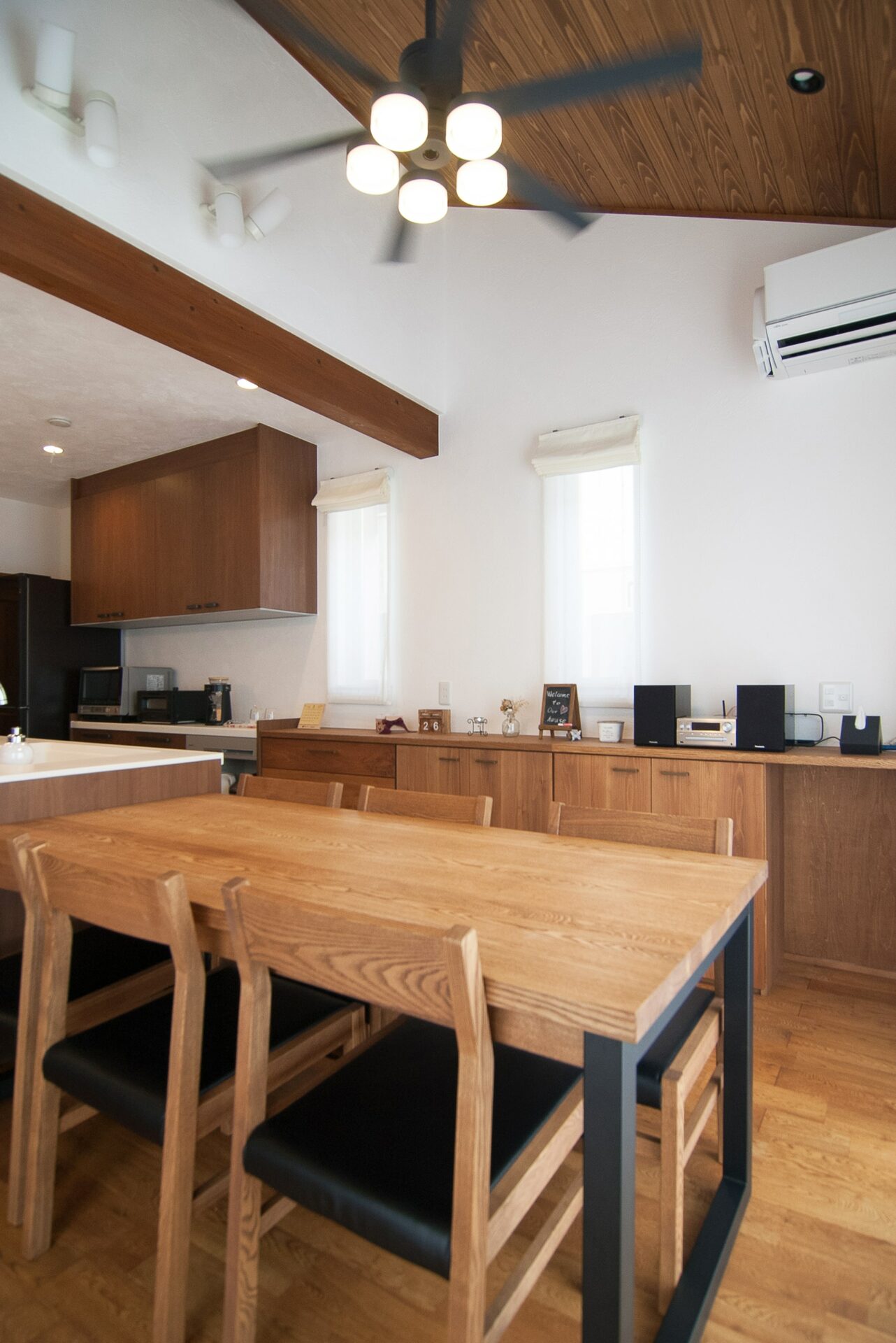 木のぬくもりがあふれるLDK。キッチンと幅を揃えたダイニングテーブルも、サイズやデザインを自由にできる造作ならでは。無垢材そのままの風合いを活かした、あたたかみのある家具で、空間全体をコーディネート。