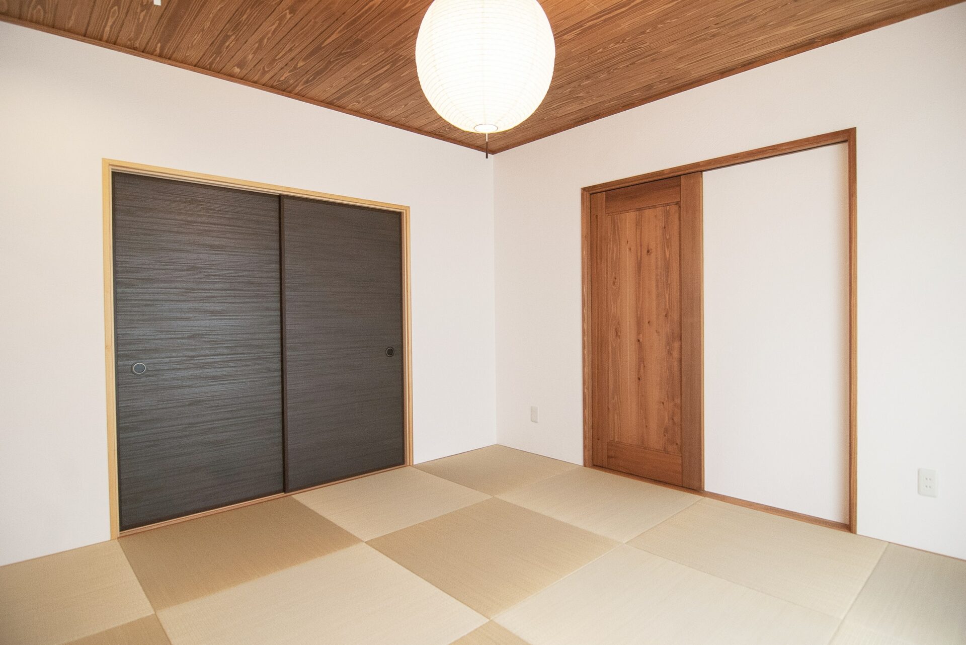 古来の日本住宅に見られる、二間続きの和室をしつらえたK様邸。奥の間は縁のない琉球畳を絣模様に配してモダンな雰囲気に。天井にも無垢材を張り巡らせ、木の質感が際立つ引き戸の扉も自社で作っています。