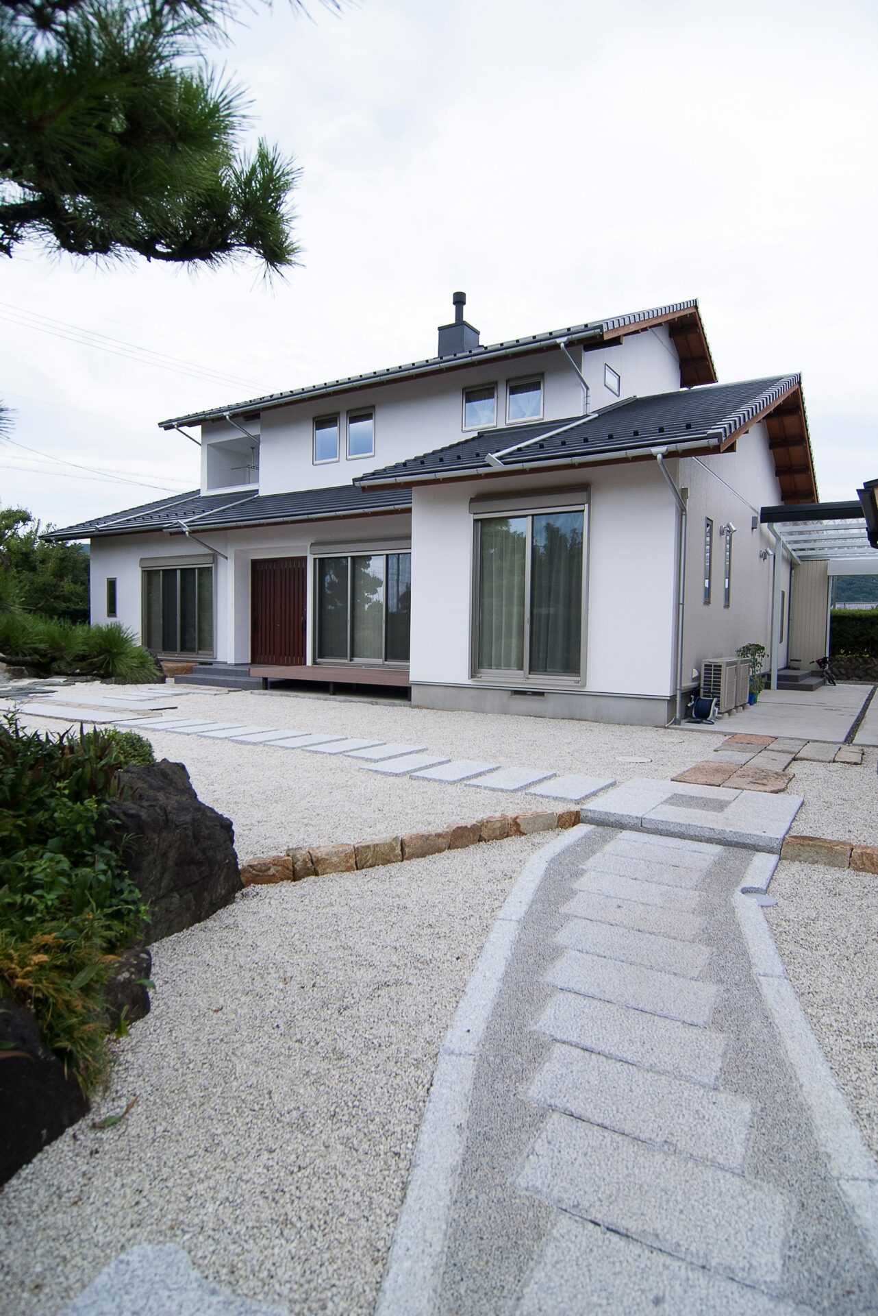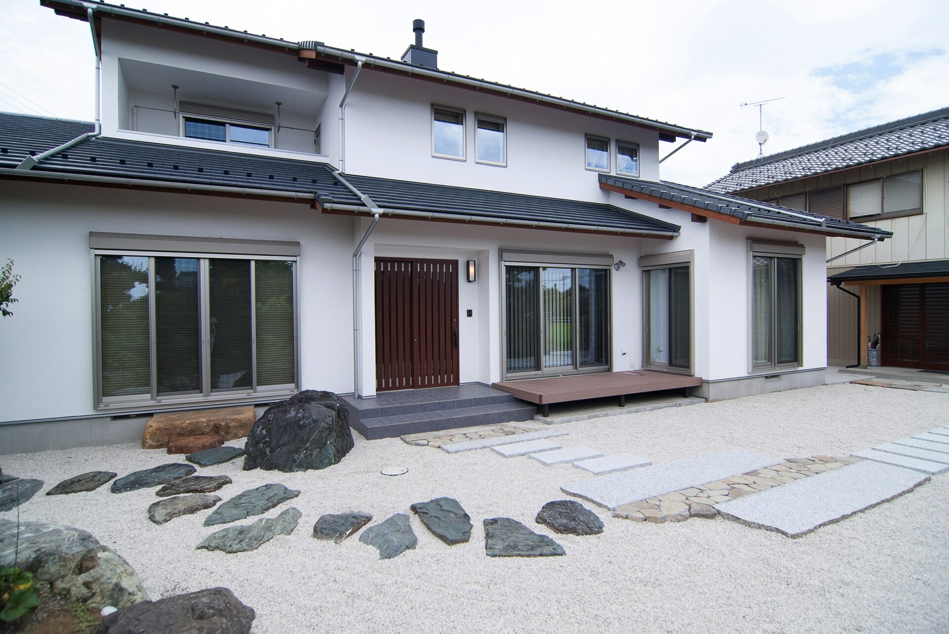 真っ白な漆喰で塗られた壁が、高級感を醸し出す外観。軒を大きくとった屋根のおかげで雨や汚れがつきにくく、漆喰本来の白さが保てます。正面の表玄関のほか、もう一つ裏玄関をもうけ、将来の二世帯同居も見据えたつくりになっています。