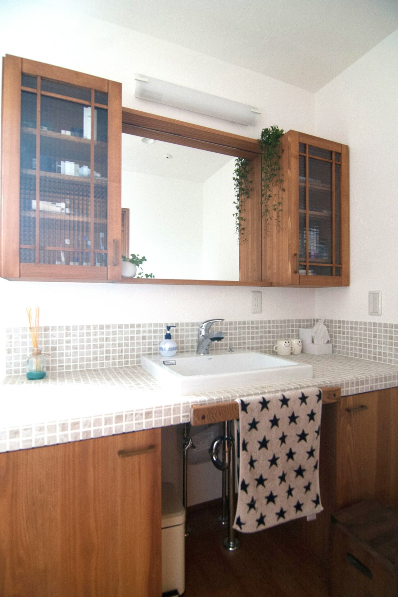 造作の洗面スペースは、家族みんなで使ってもゆとりある広さに。タイルの目地には撥水効果のあるコーティングが施されているので、日々のお手入れも1日1回、サッと拭くだけで済むそう。大きなミラーと収納扉は、模様が入ったガラスと格子で、アンティークな雰囲気になりました。